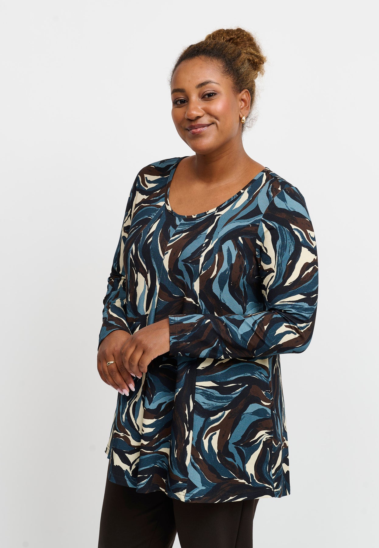 Et elegant og iøjnefaldende valg til både hverdag og fest – denne top i A-shape har et flot, kunstnerisk bladprint i blå og sorte nuancer, der skaber dybde og spil. Pasformen er let og feminin med rund hals og lange ærmer, og den bløde viskosejersey med stræk gør den behagelig at have på hele dagen.