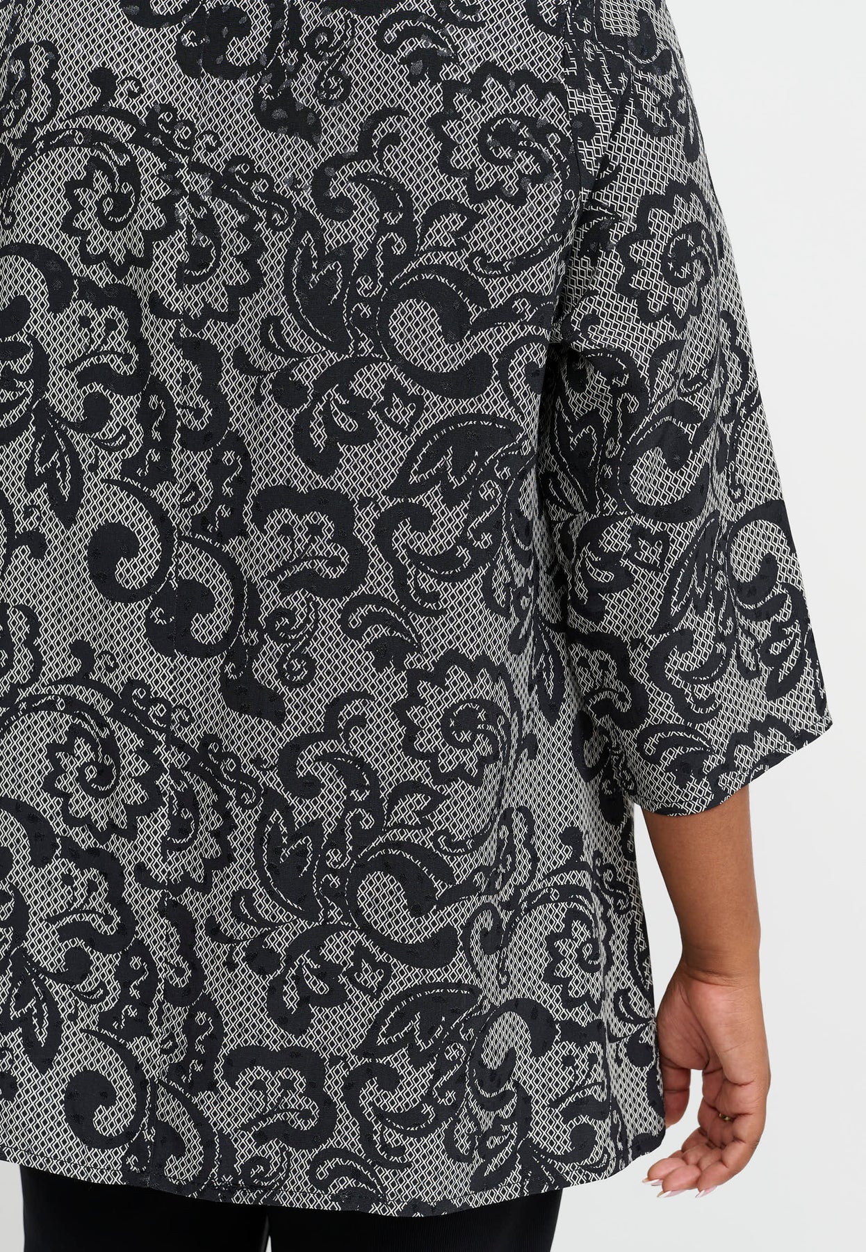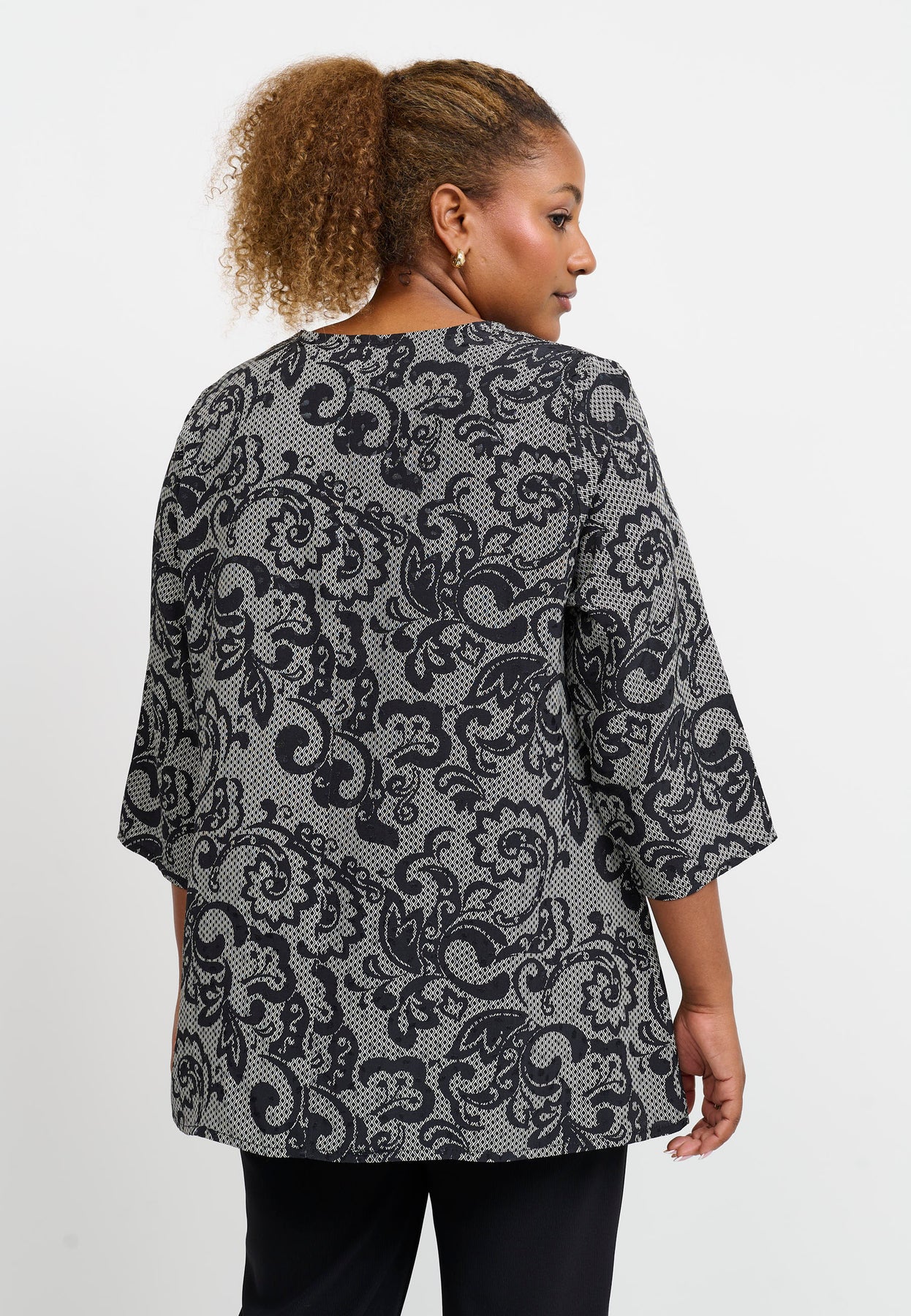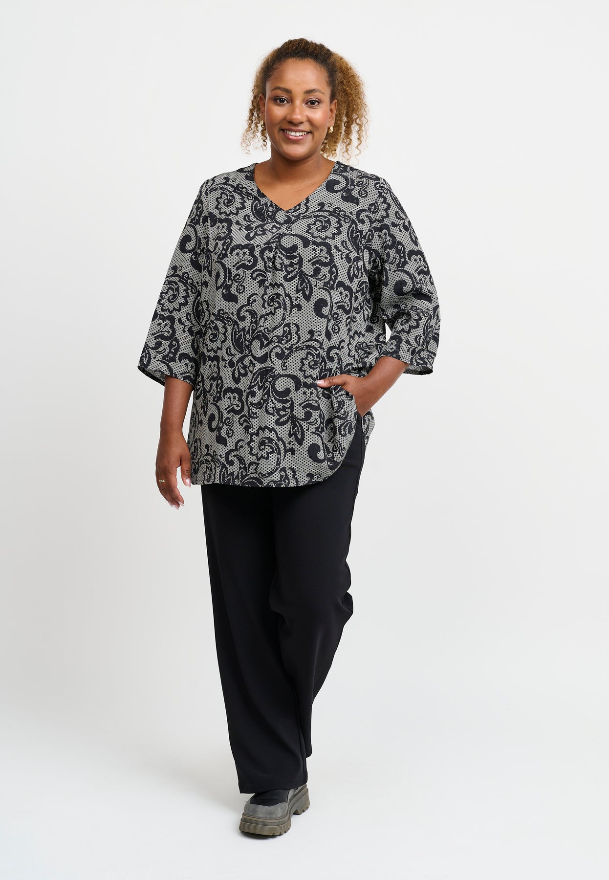 En elegant og komfortabel bluse med et moderne, grafisk mønster, der giver et stilfuldt og karakterfuldt udtryk. Den er skåret i en flatterende A-shape, som falder let om kroppen og giver god bevægelsesfrihed. Det rene viskosemateriale føles behageligt mod huden og gør blusen ideel til både hverdag og lidt finere anledninger.