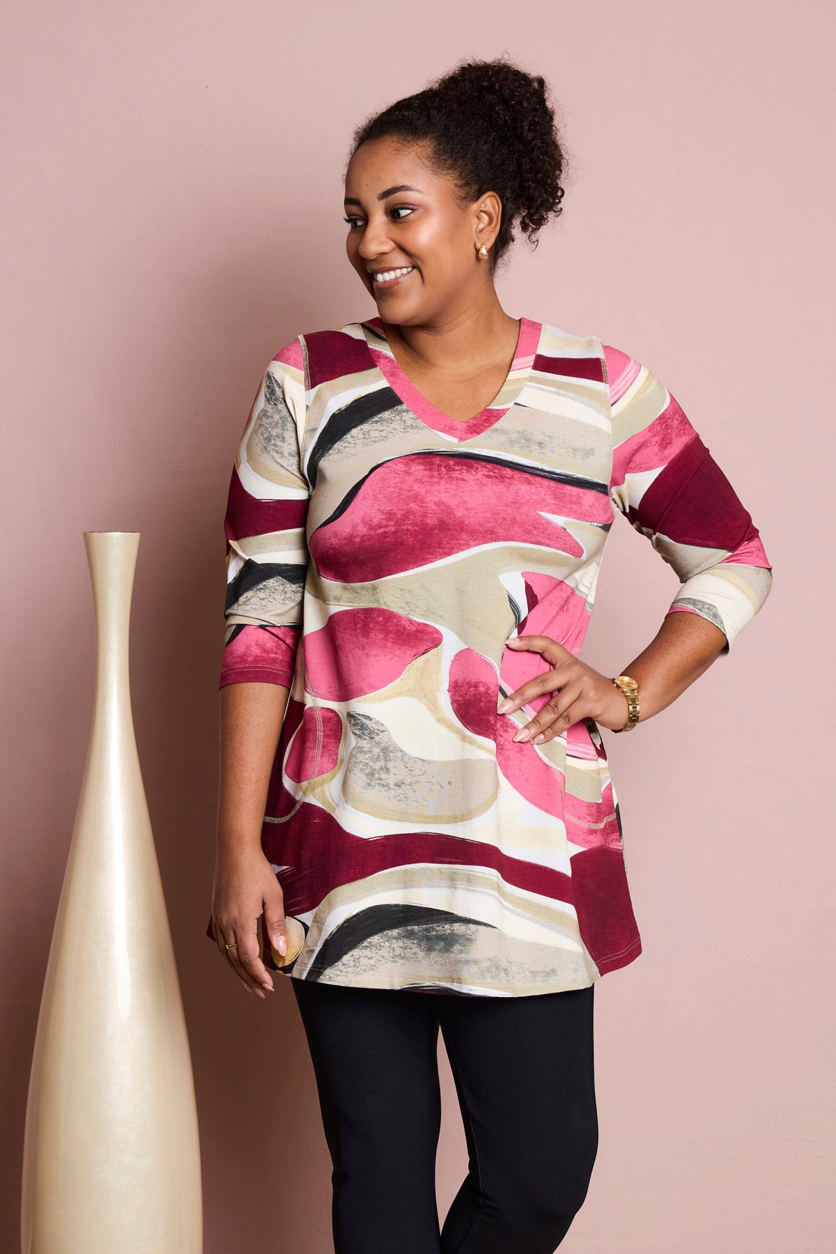 Style tunikaen med smalle bukser eller leggings for en afbalanceret silhuet, eller brug den med lyse bukser for et mere let og åbent udtryk.