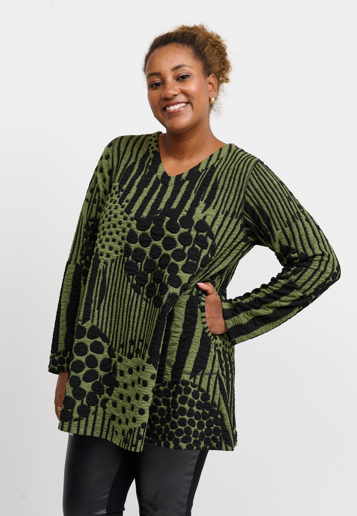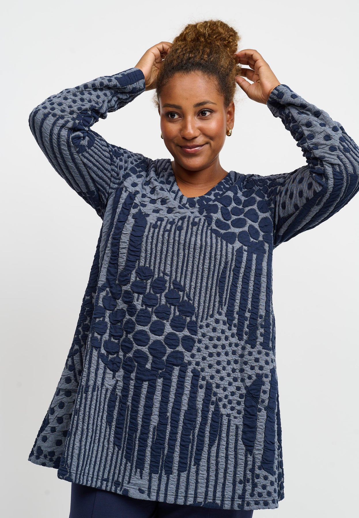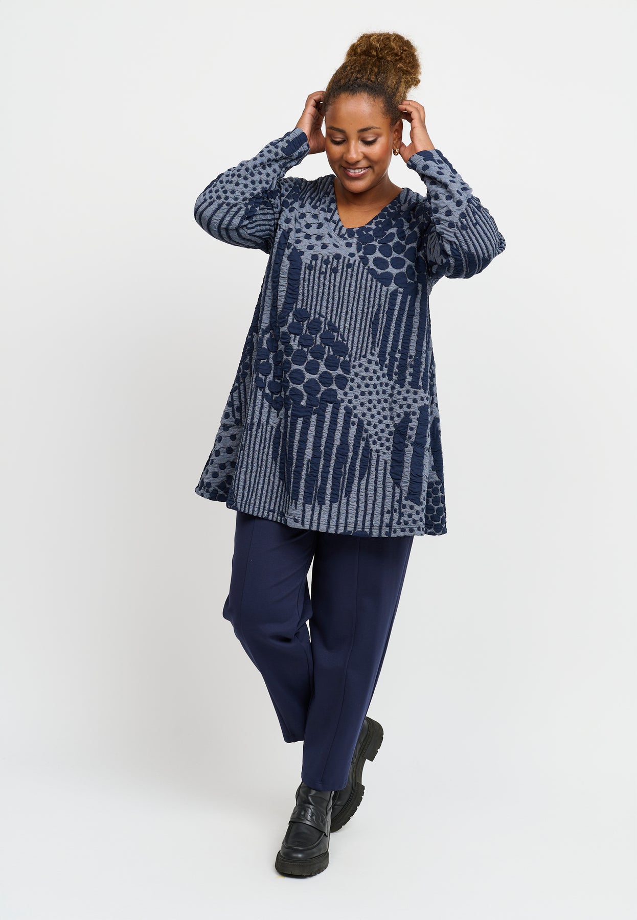En tunika med kant og karakter. Det grafiske print i tofarvet design tilføjer personlighed, mens den A-formede pasform og det bløde, elastiske materiale sikrer et flot fald og masser af bevægelse. Tunikaens struktur og tyngde gør den velegnet til brug gennem hele sæsonen – alene eller som del af et lag-på-lag-look.