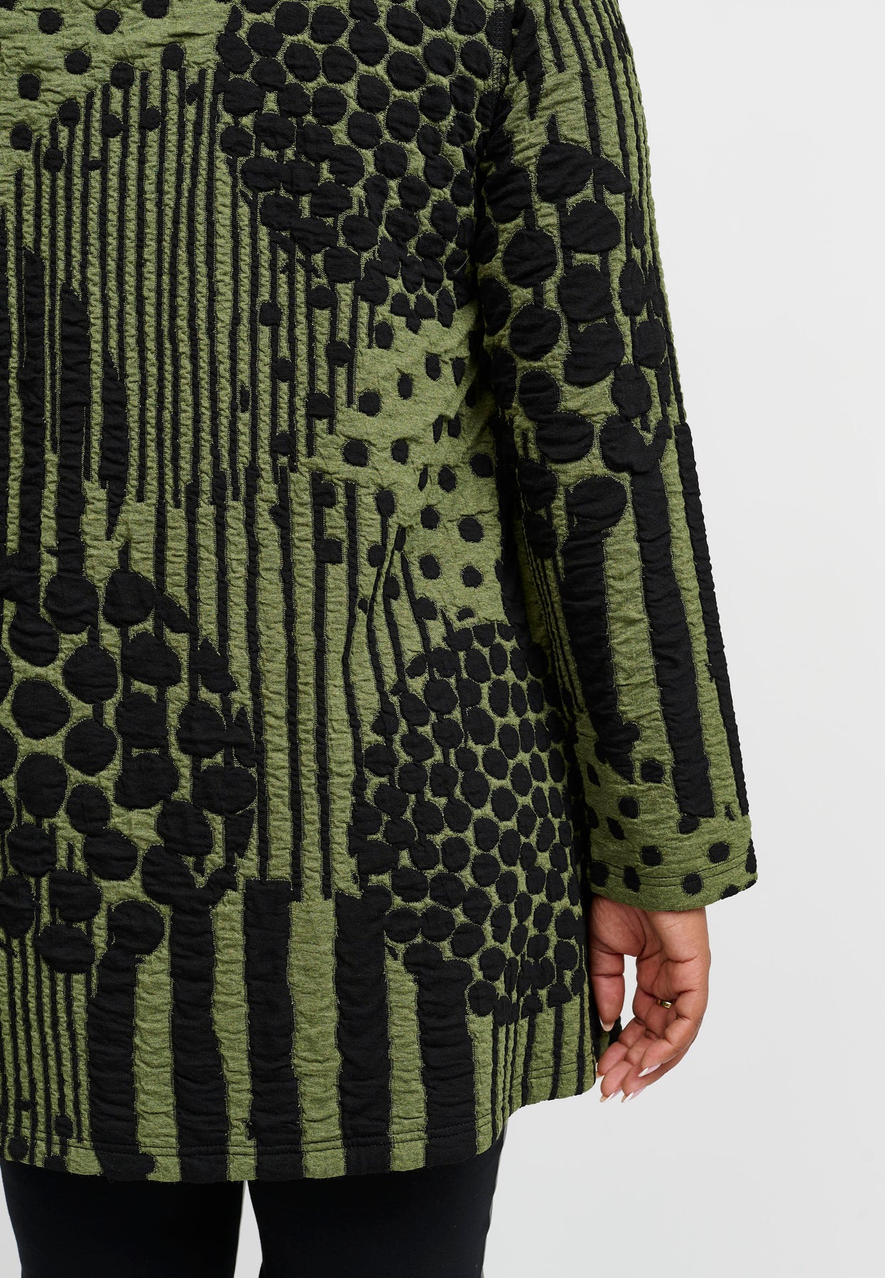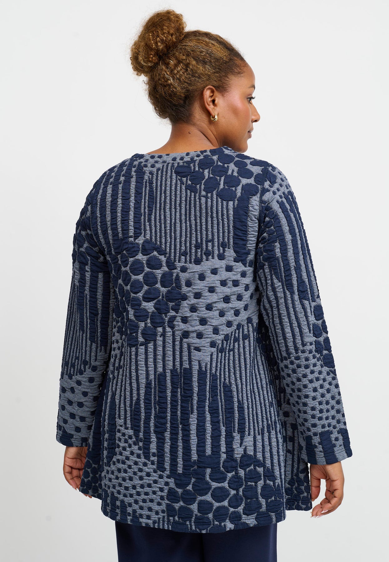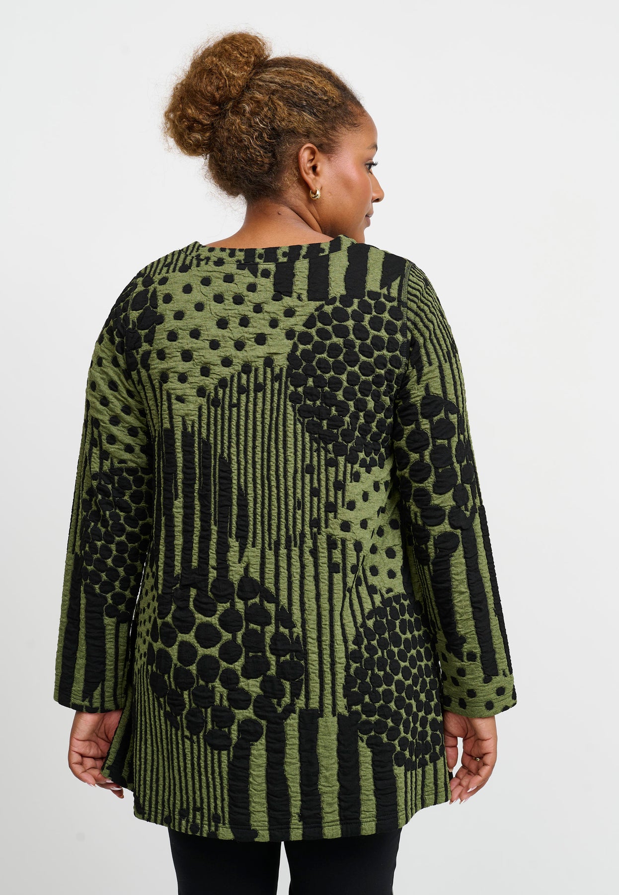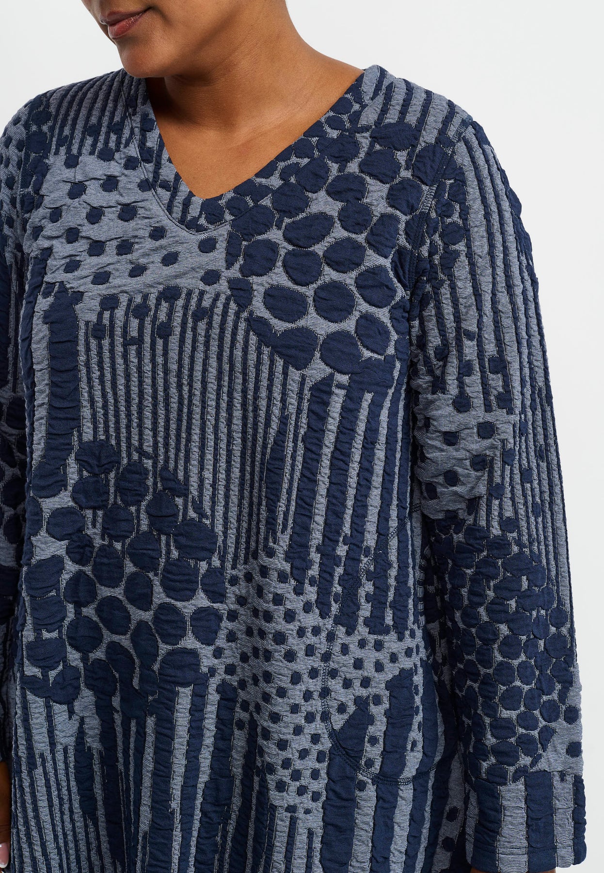 En tunika med kant og karakter. Det grafiske print i tofarvet design tilføjer personlighed, mens den A-formede pasform og det bløde, elastiske materiale sikrer et flot fald og masser af bevægelse. Tunikaens struktur og tyngde gør den velegnet til brug gennem hele sæsonen – alene eller som del af et lag-på-lag-look.