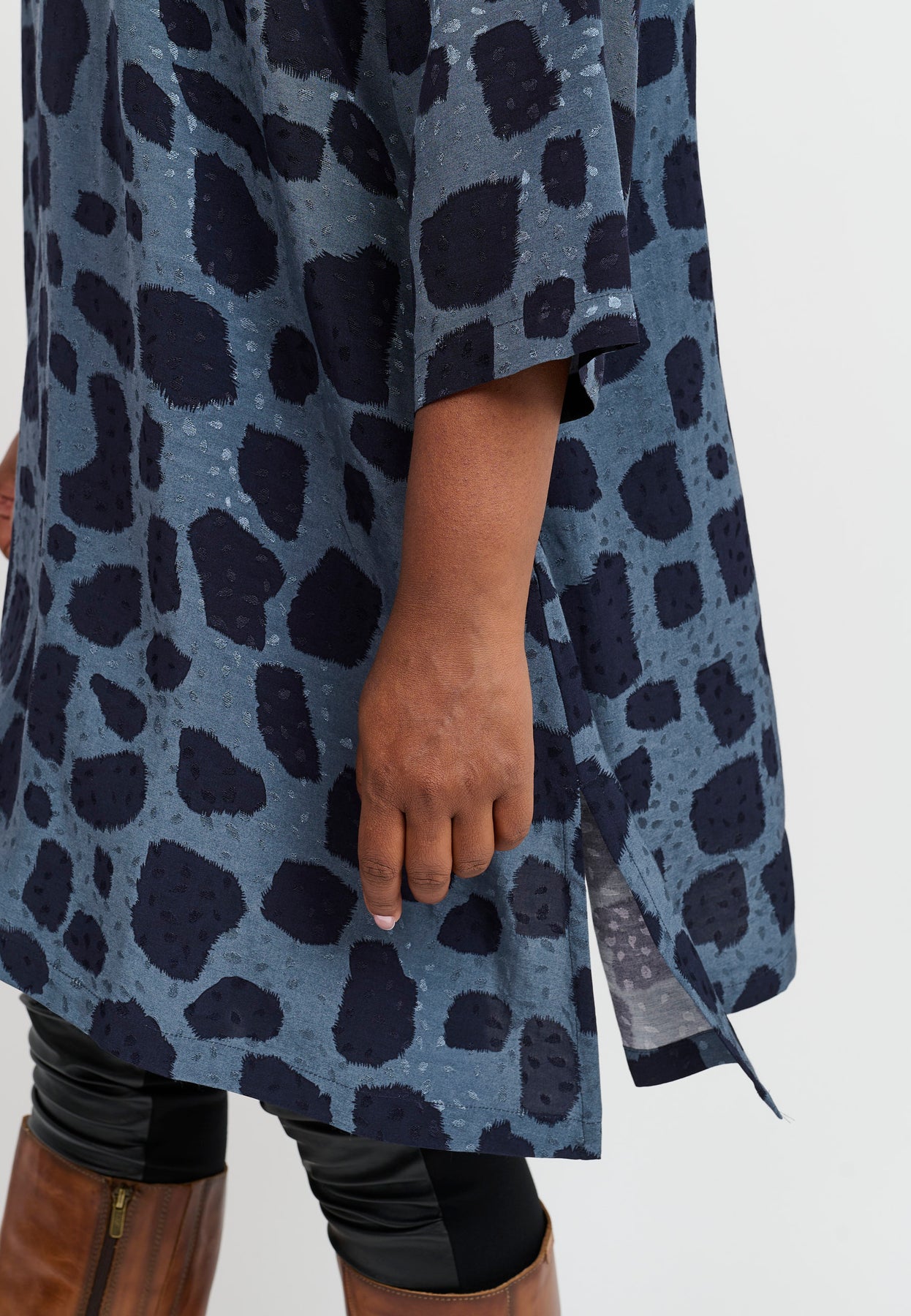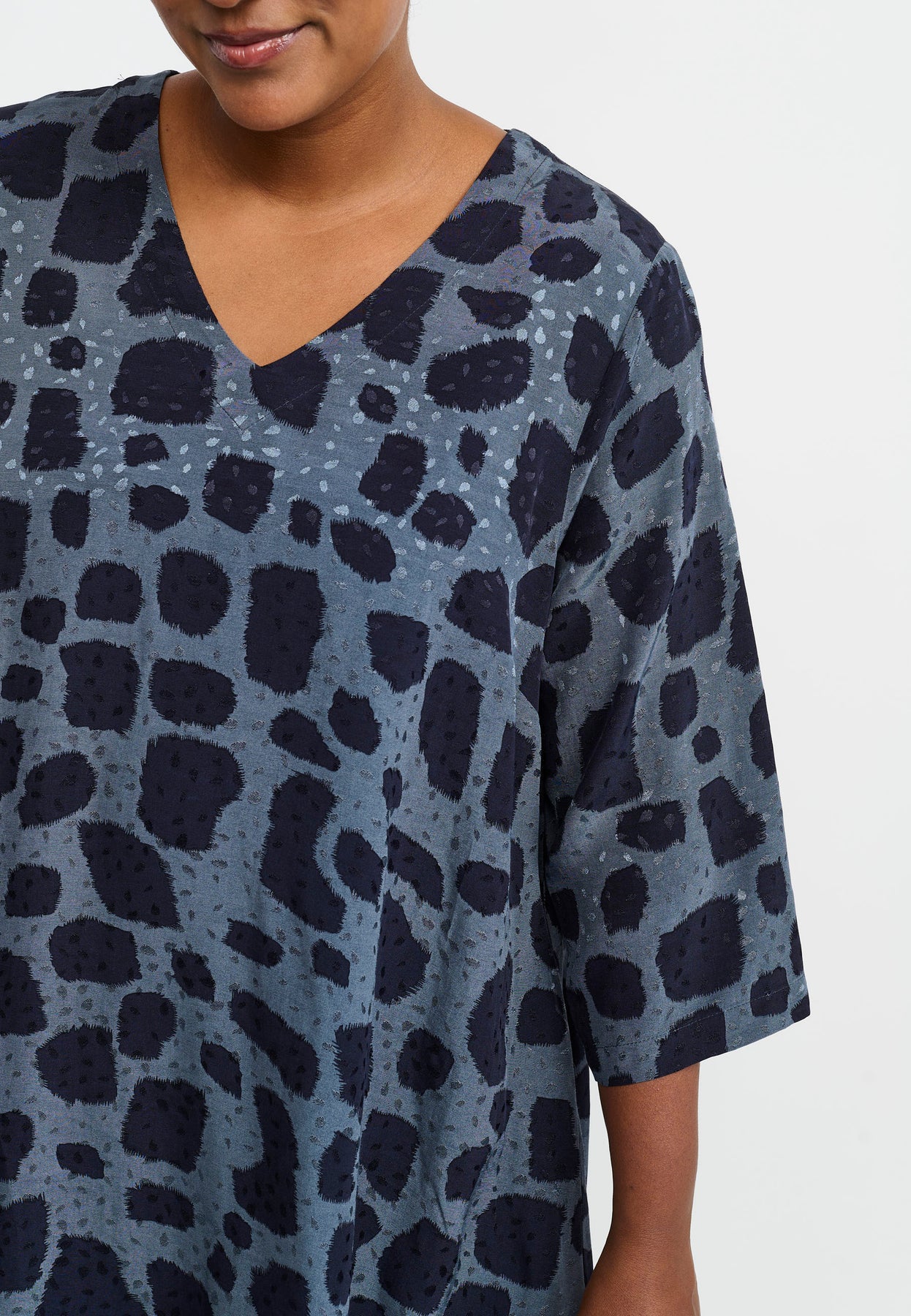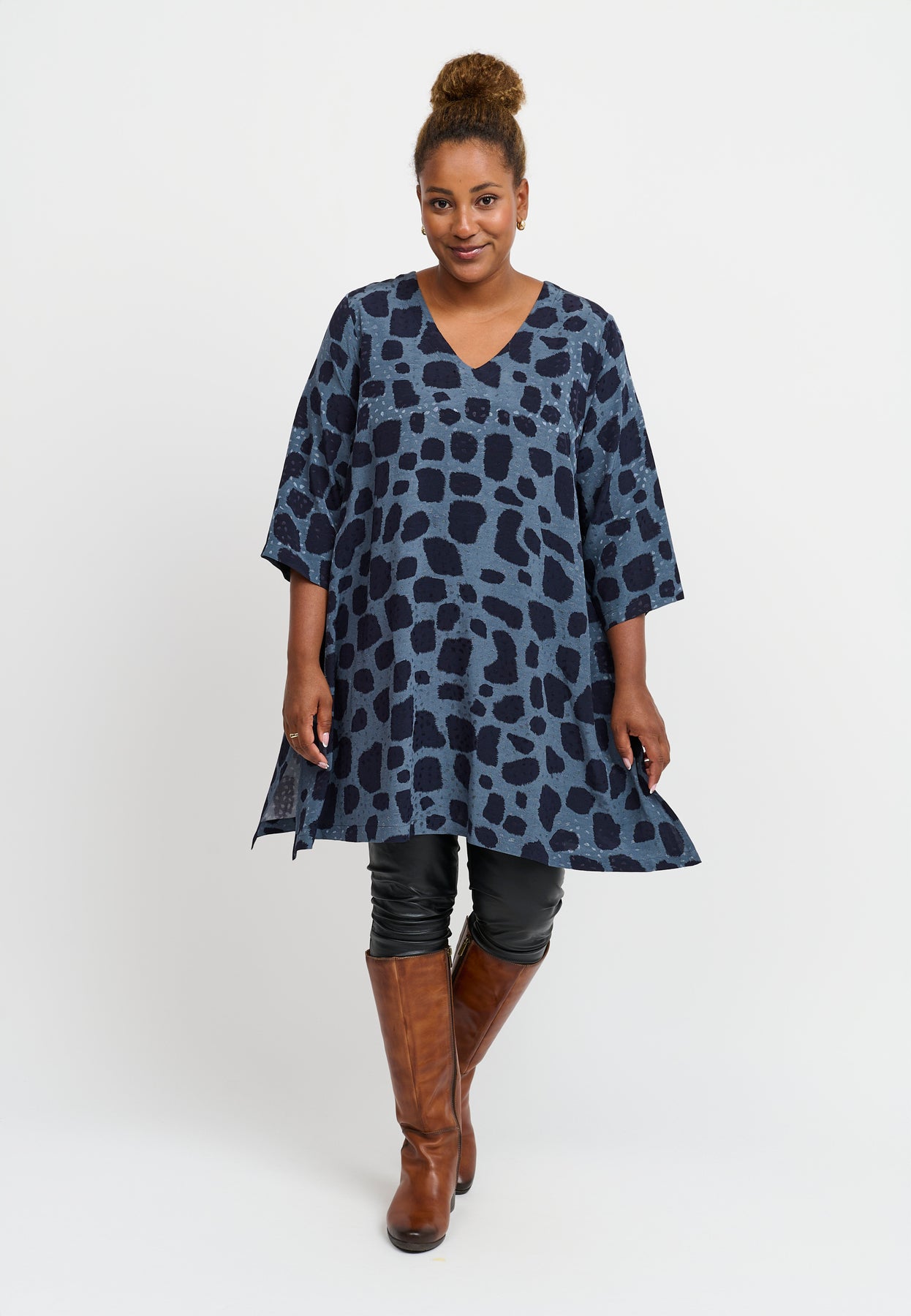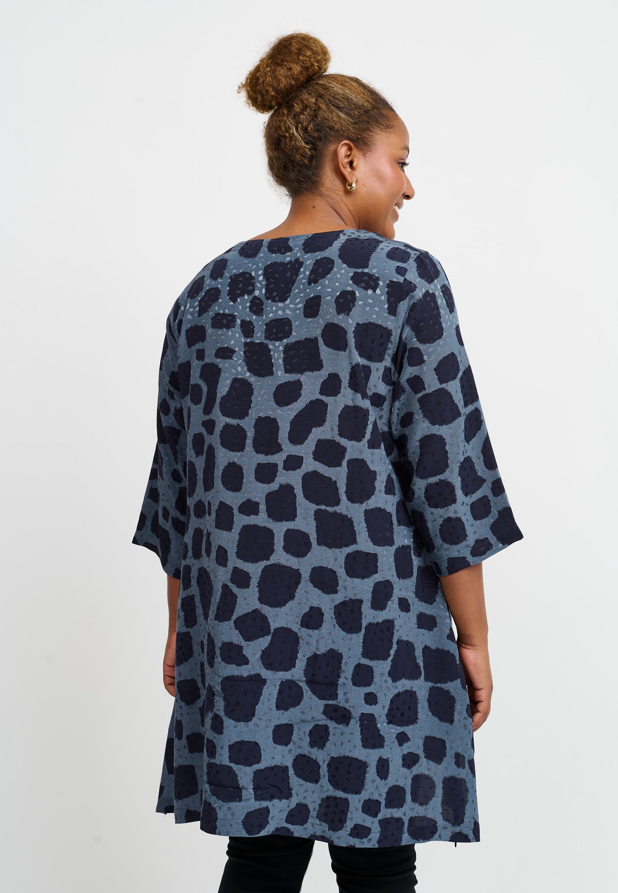 En statement-tunika med et cool, moderne print og en afslappet pasform. Det store mønster og den lette viskosekvalitet giver et levende udtryk, mens den løse A-form og de korte ærmer gør den oplagt til både varme dage og lag-på-lag styling. Det enkle snit lader printet få fuld opmærksomhed – perfekt til dig, der gerne vil skille dig lidt ud.