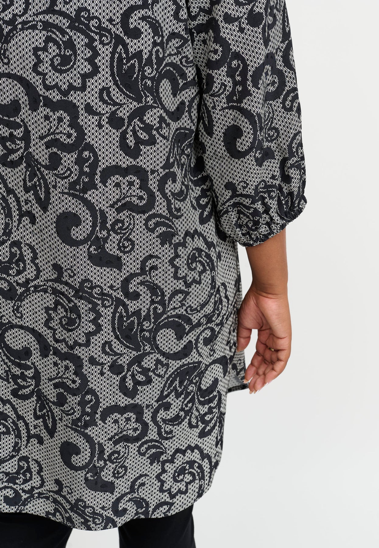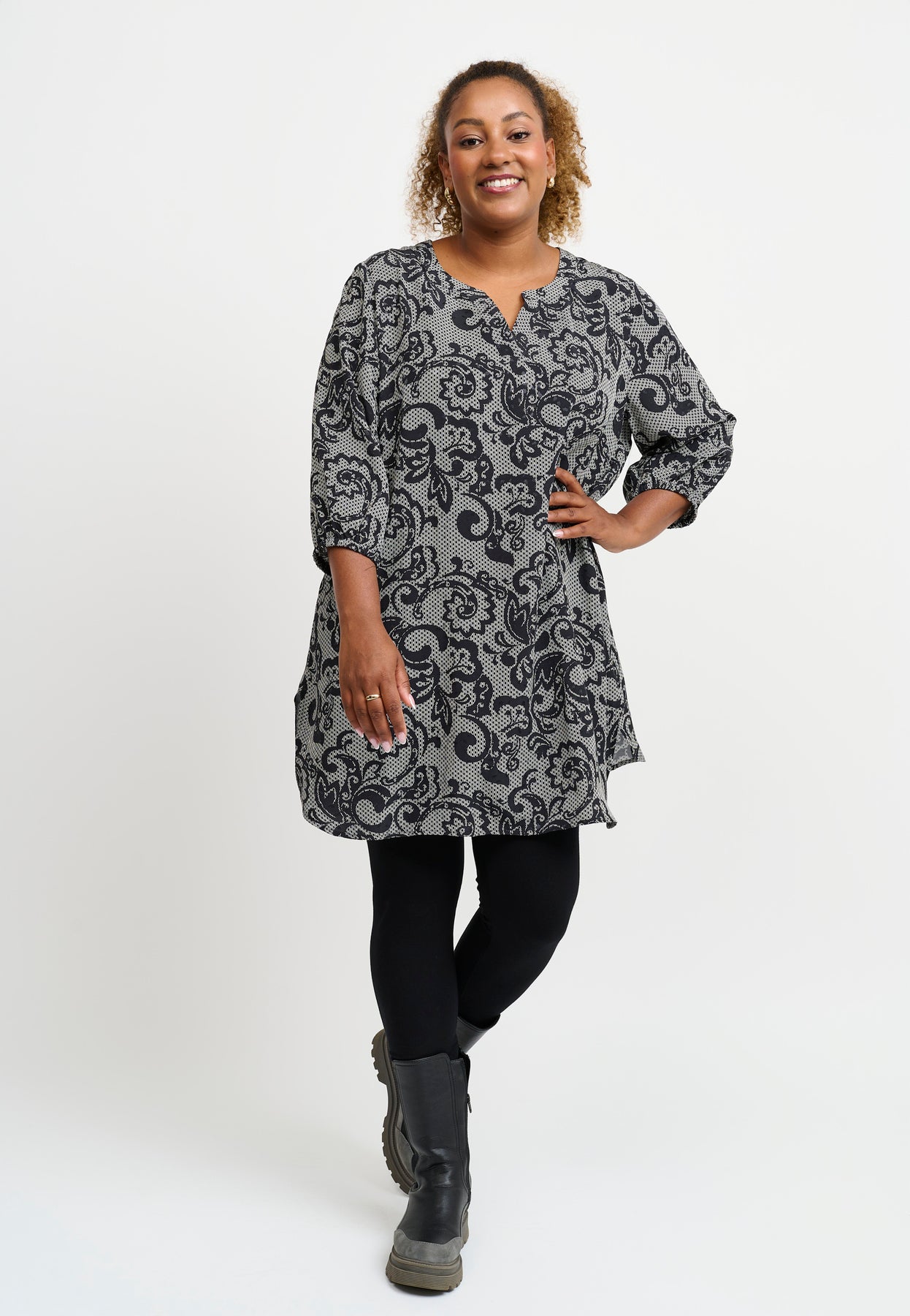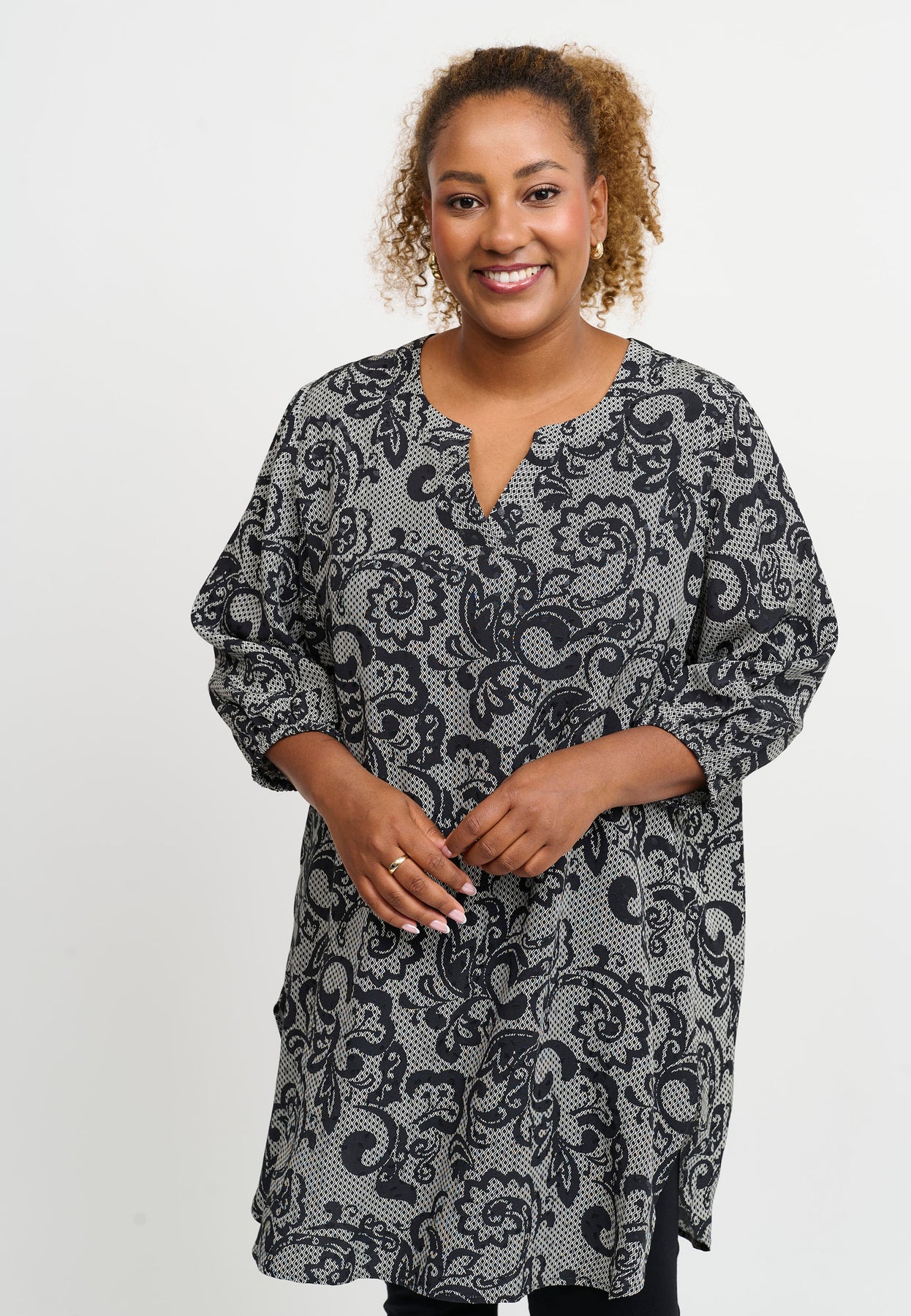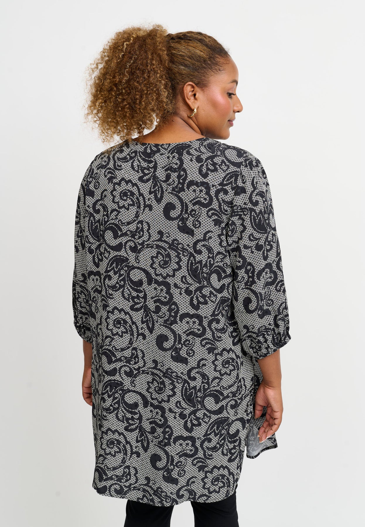 Denne klassiske viskosetunika er dekoreret med et håndtegnet, blomsterinspireret mønster i grå og hvide toner – et stilrent valg med masser af personlighed. Modellen har en afslappet pasform med rund hals og lange ærmer, og den bløde viskosekvalitet giver en let og glidende fornemmelse mod huden.