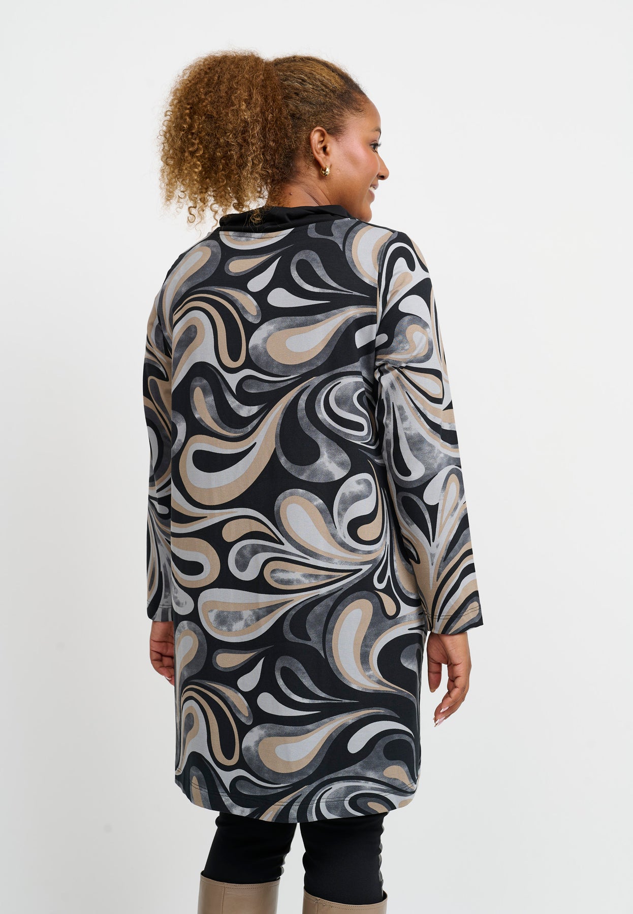 En stilfuld og komfortabel tunika med et iøjnefaldende bølgemønster i klassiske grå og sorte nuancer. Den A-formede pasform falder blødt over kroppen og giver en elegant silhuet med masser af bevægelsesfrihed. Tunikaen har rund hals, lange ærmer og er lavet i en blød jerseykvalitet med stræk, som føles behagelig hele dagen.