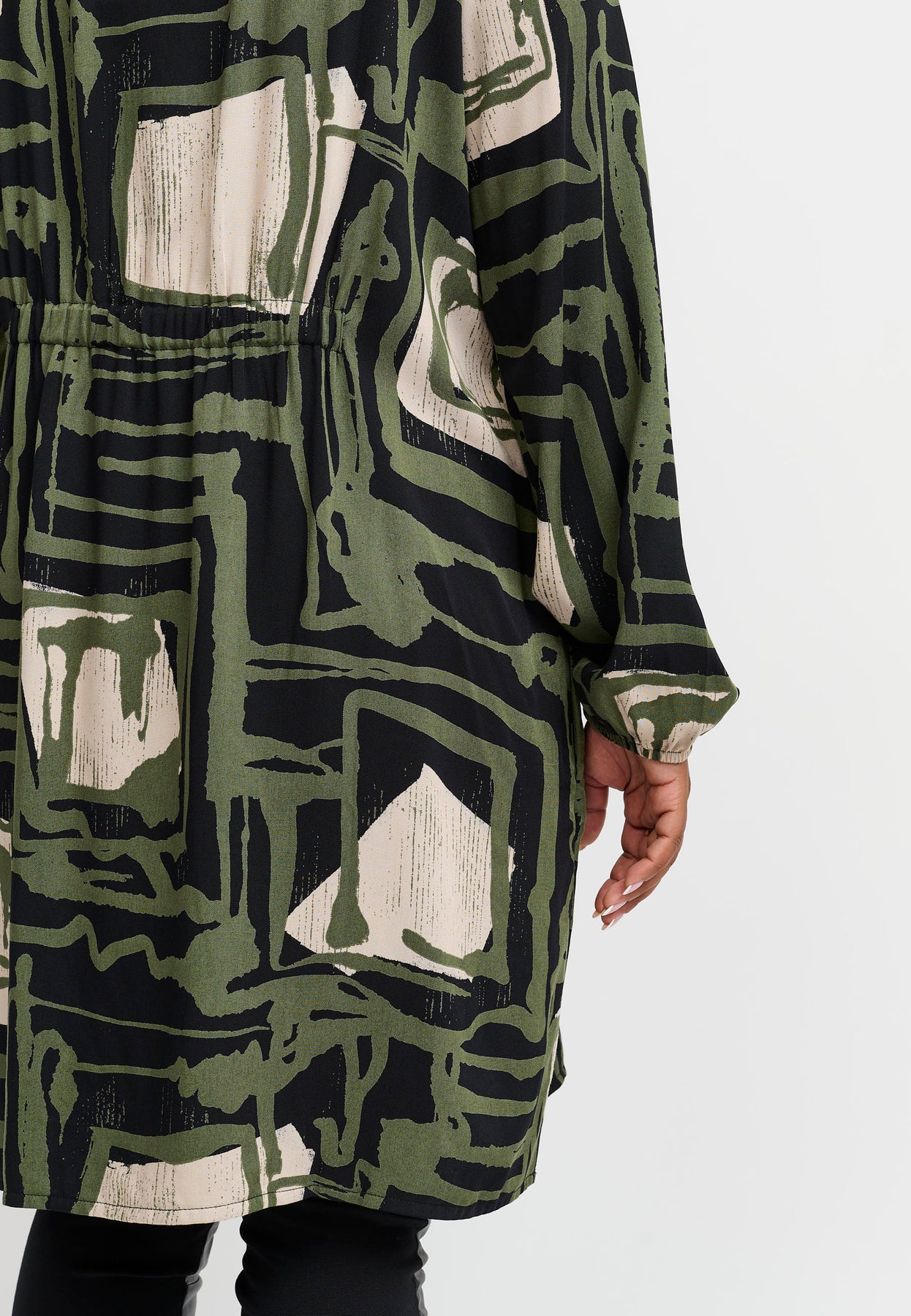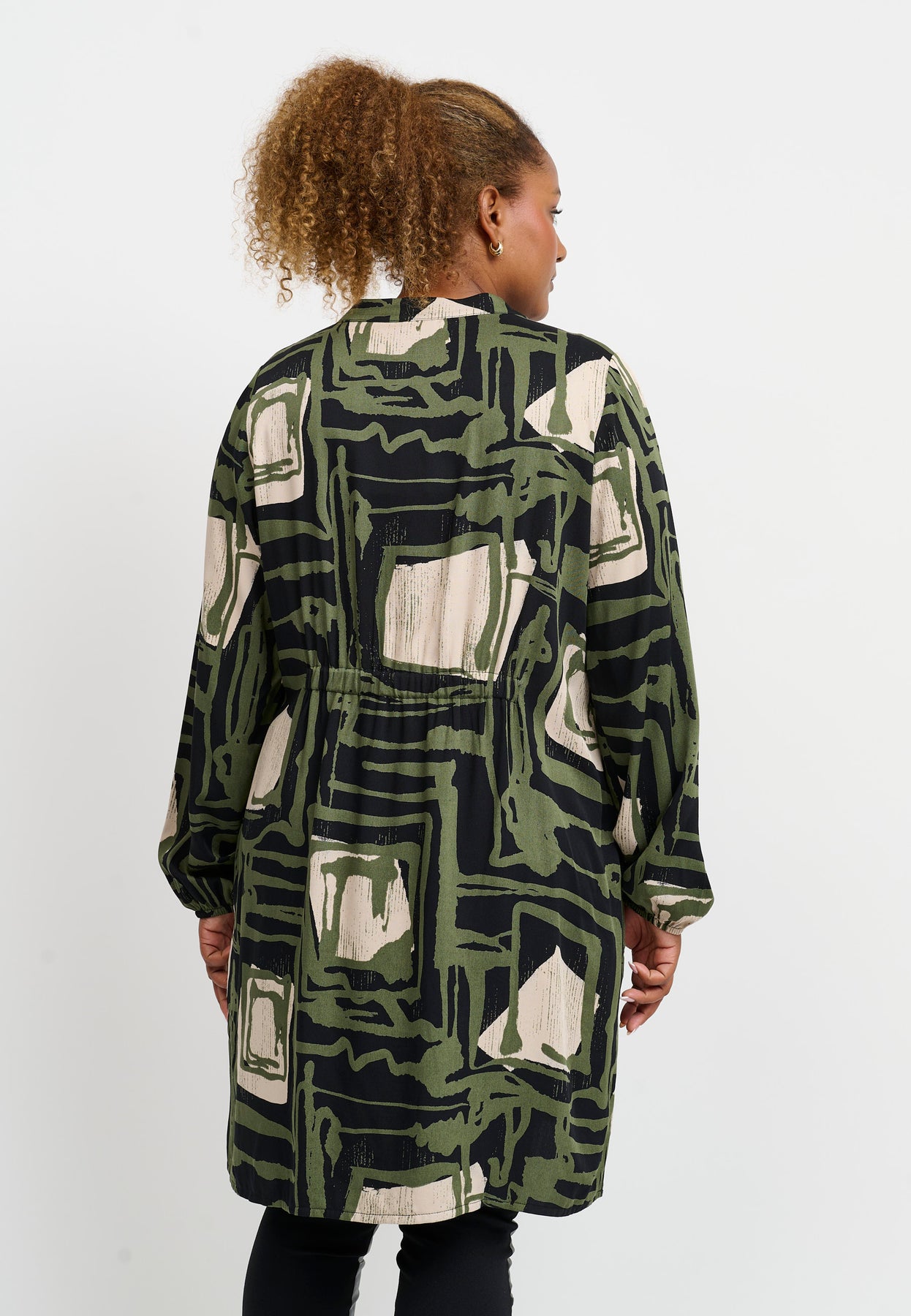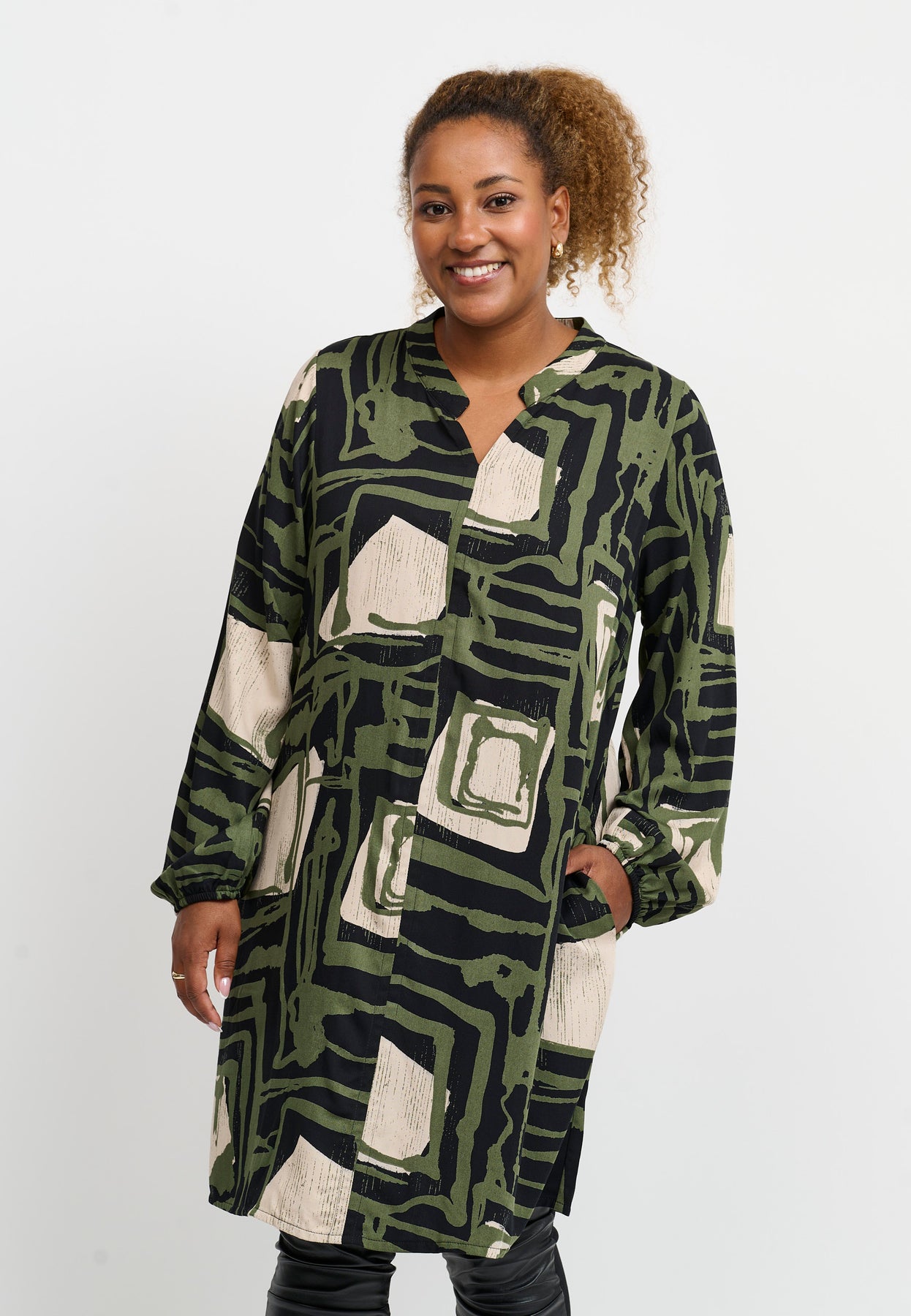 En stilfuld og moderne tunika med et markant, grafisk print i grønne og sorte nuancer. Den har en flatterende A-formet pasform, der giver god bevægelsesfrihed og falder let over kroppen. Den bløde viskosekvalitet føles behagelig mod huden og gør tunikaen ideel til både hverdag og lidt pænere anledninger. Det enkle snit med rund hals og lange ærmer gør den nem at style.