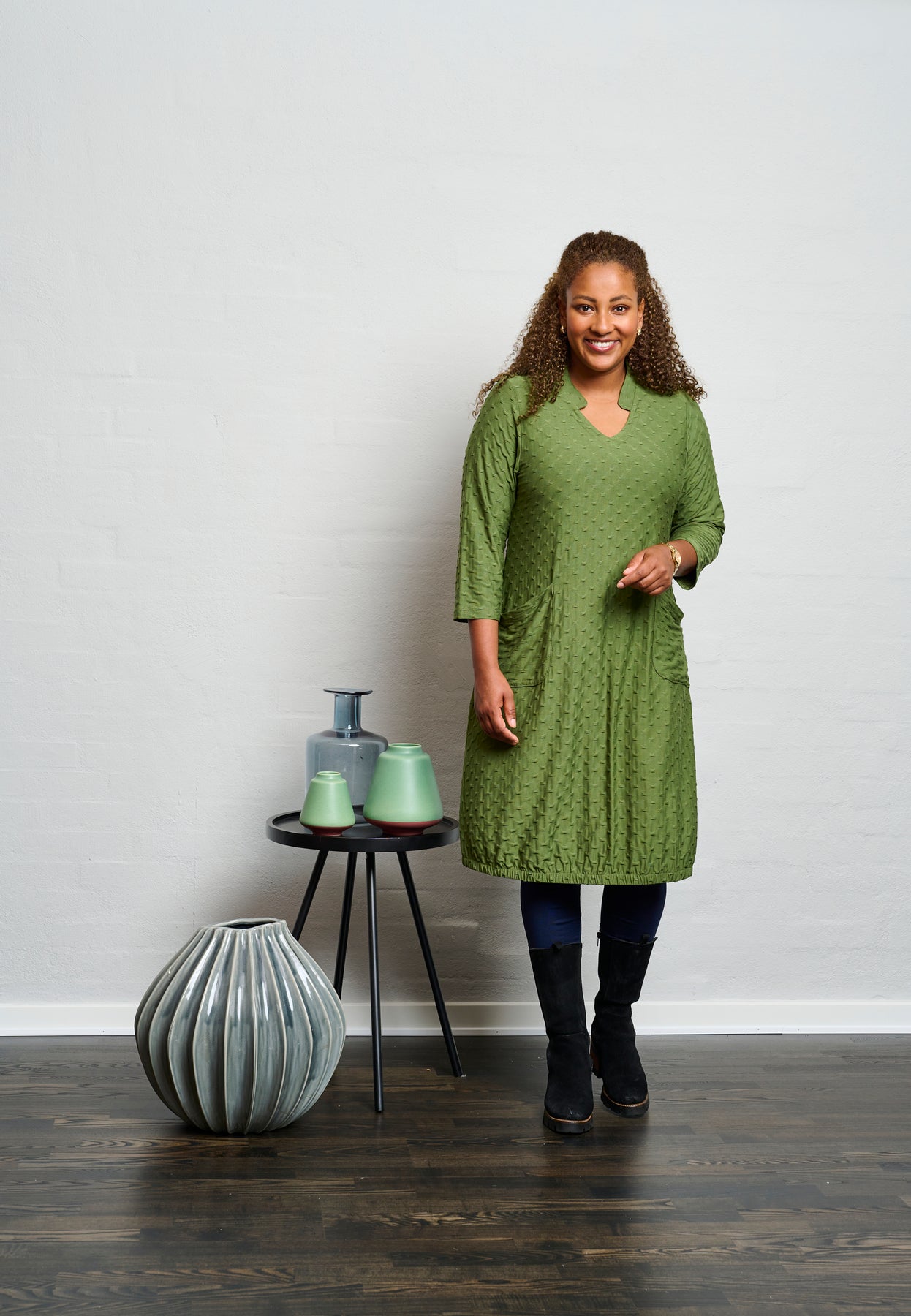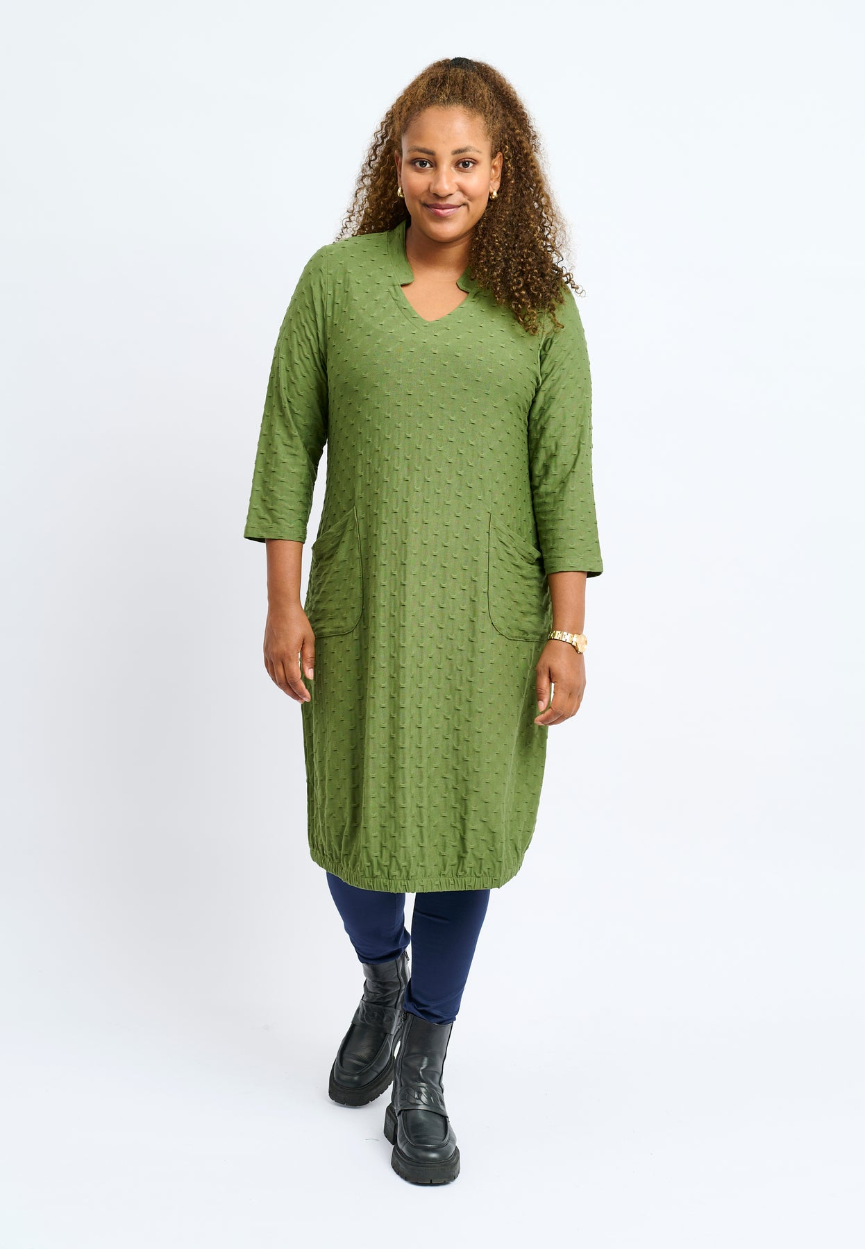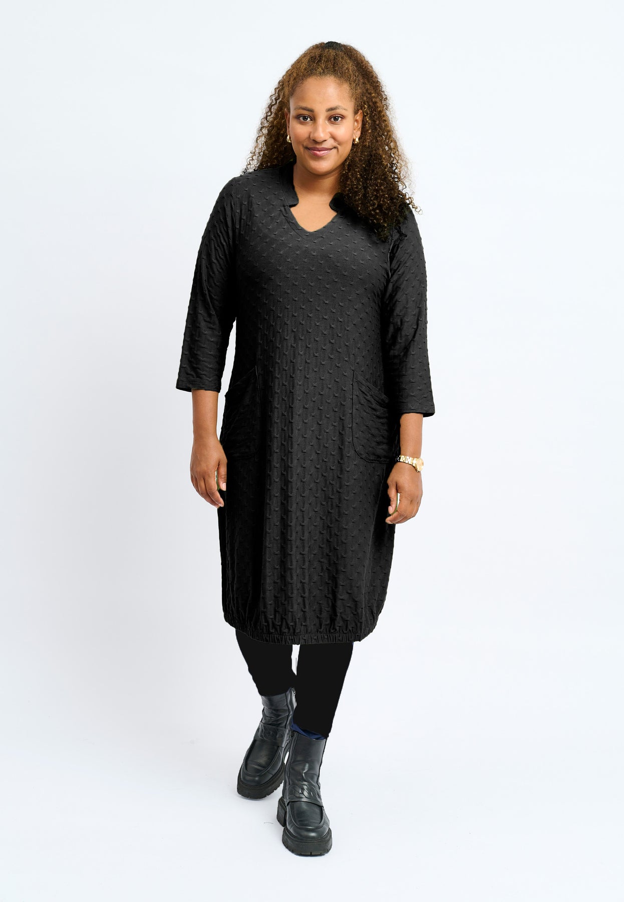 Oplev ren elegance med denne skønne kjole fra Pont Neuf. Det enkle design fremhæves af en flatterende V-halsudskæring og ¾-lange ærmer, der tilsammen skaber et sofistikeret look. Kjolen er fremstillet i et blødt og strækbart materiale, som sikrer en behagelig pasform hele dagen. De diskrete lommer tilføjer en praktisk detalje uden at gå på kompromis med stilen.