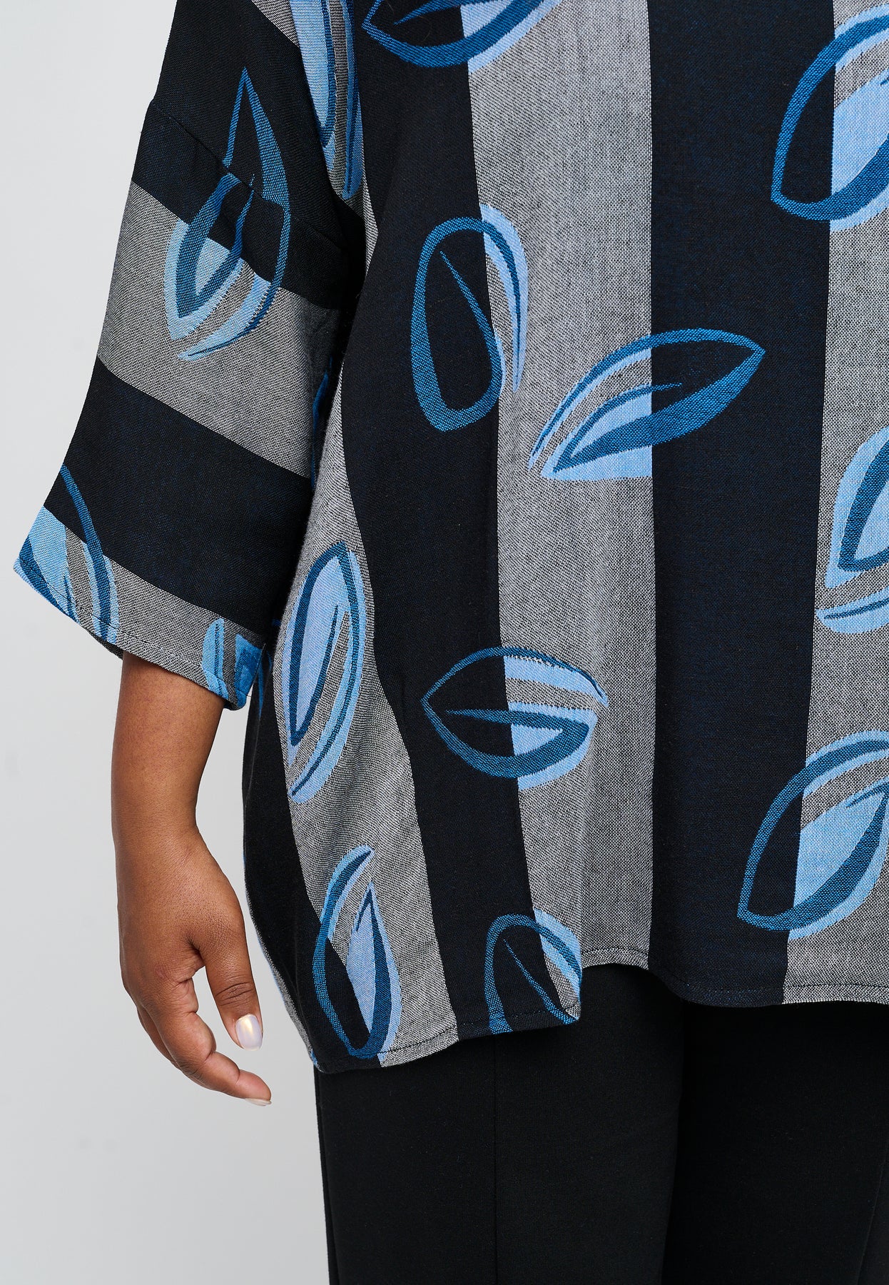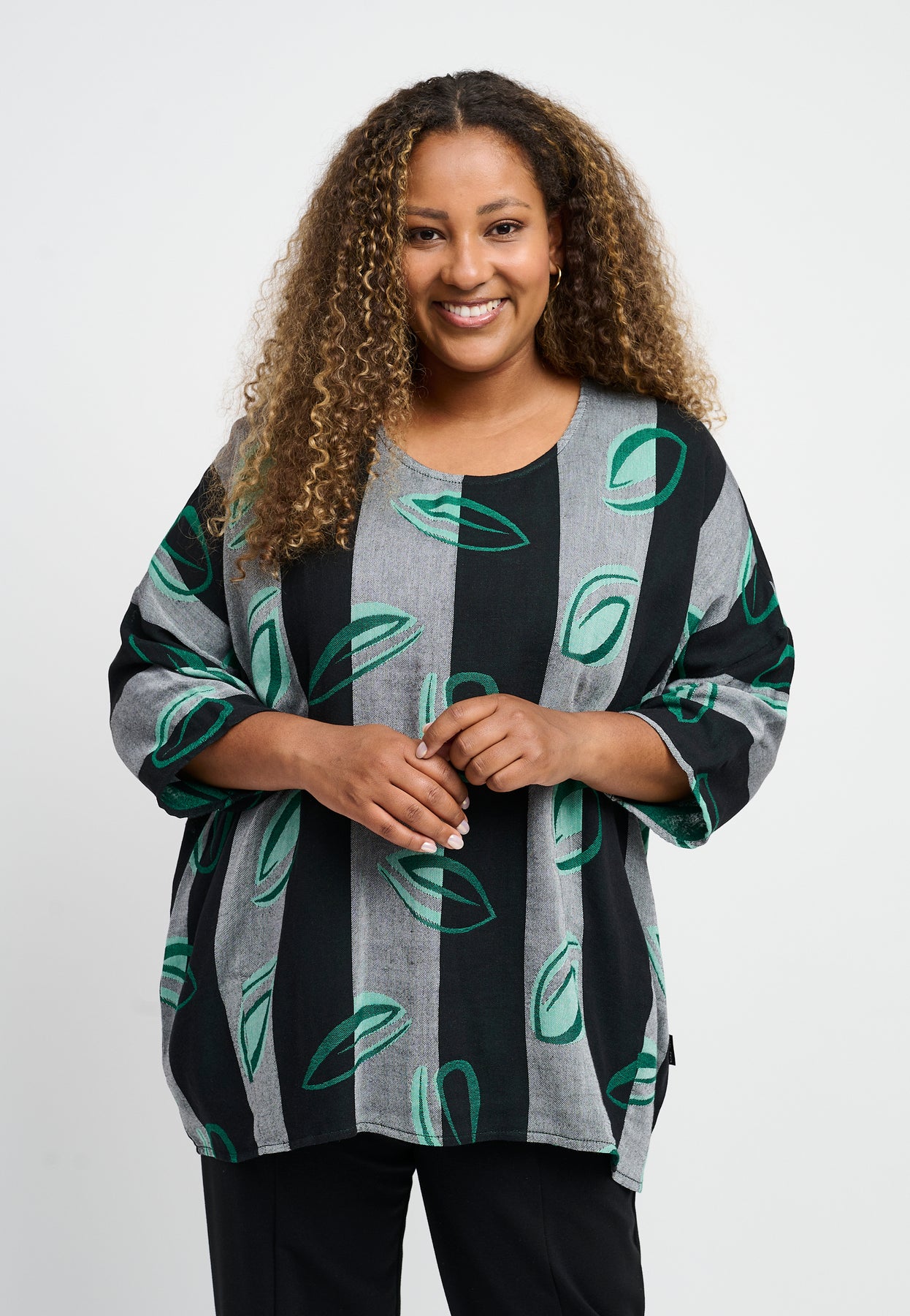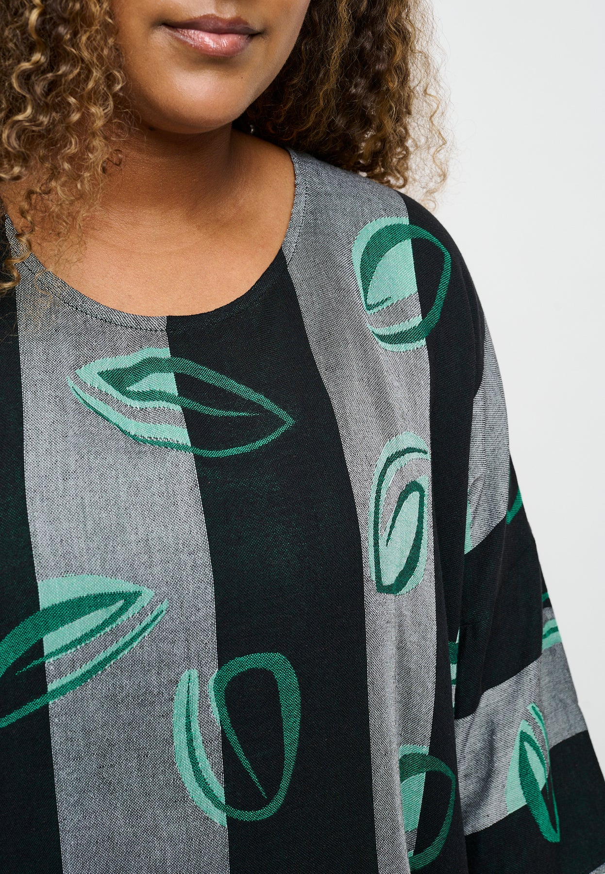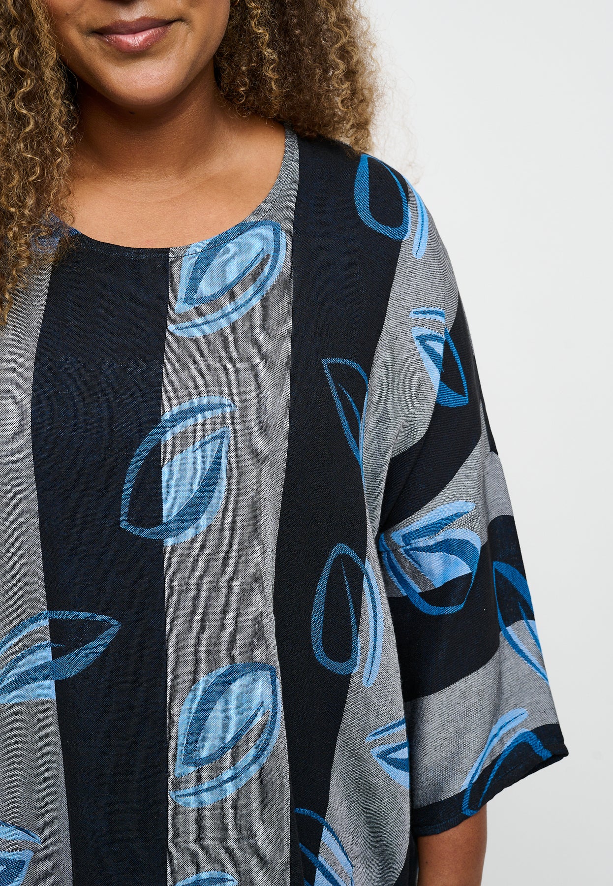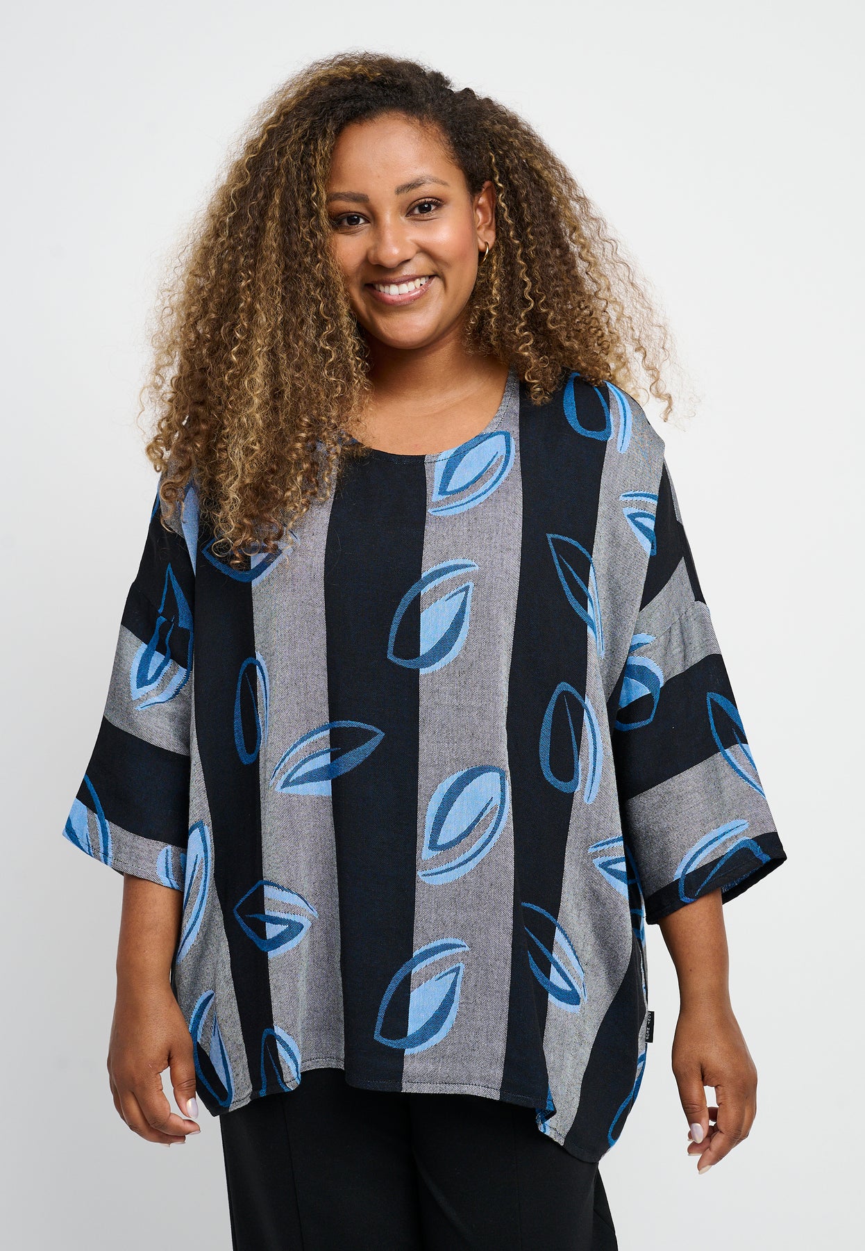 Fin bluse med ¾-lange og en rund halsudskæring. Den har et flot, bredstribet design med et farverigt print. Blusen er lavet i en let og lækker bomuldsblanding, og den har en oversized pasform, der er behagelig og rummelig.