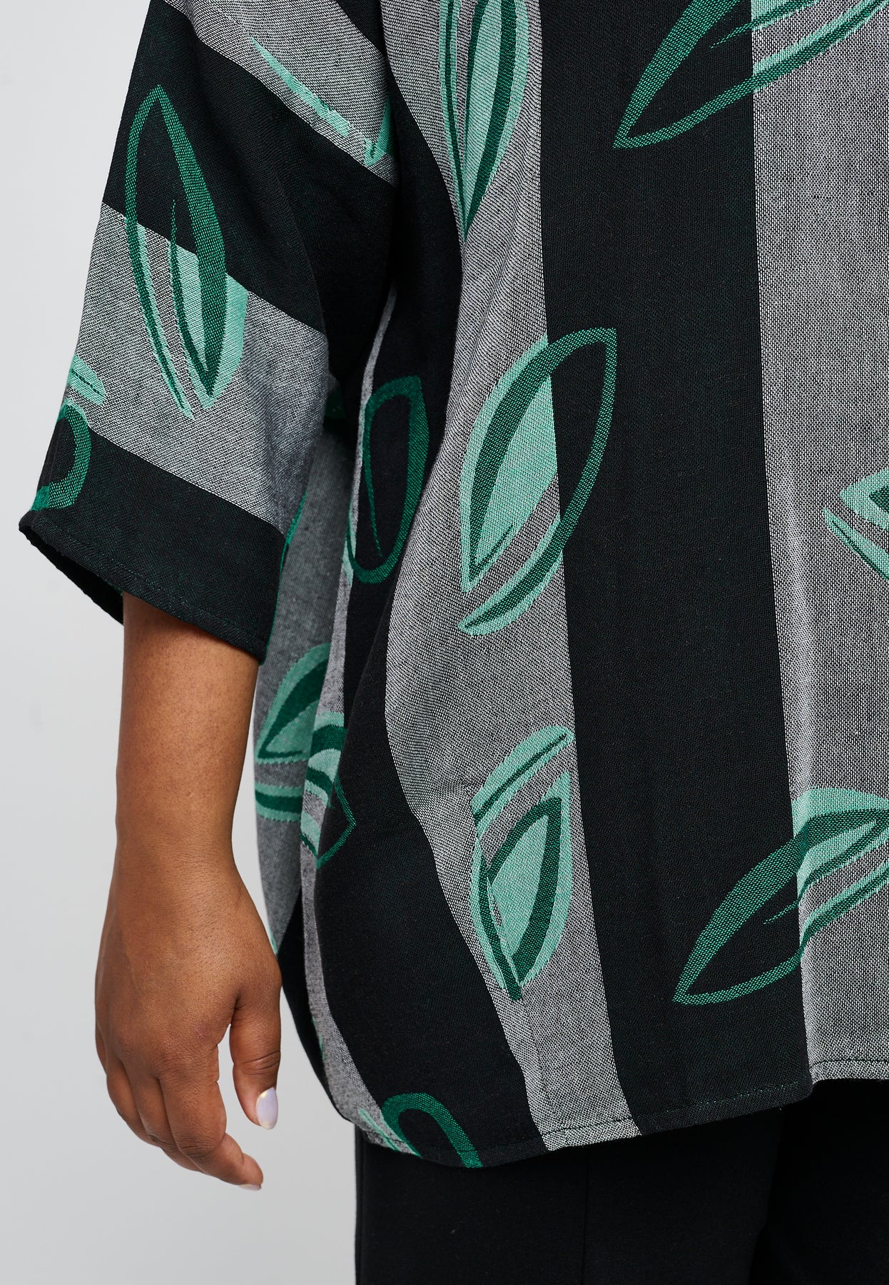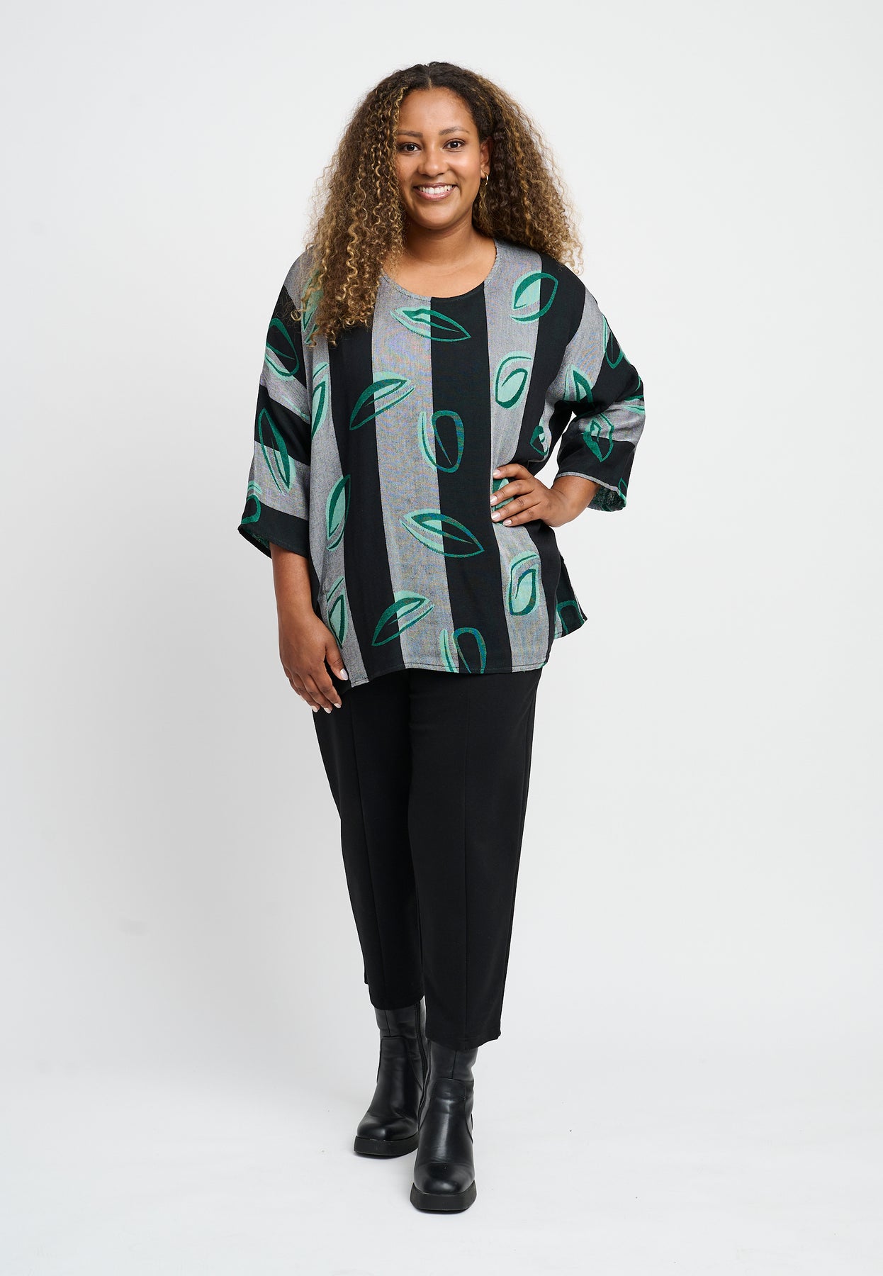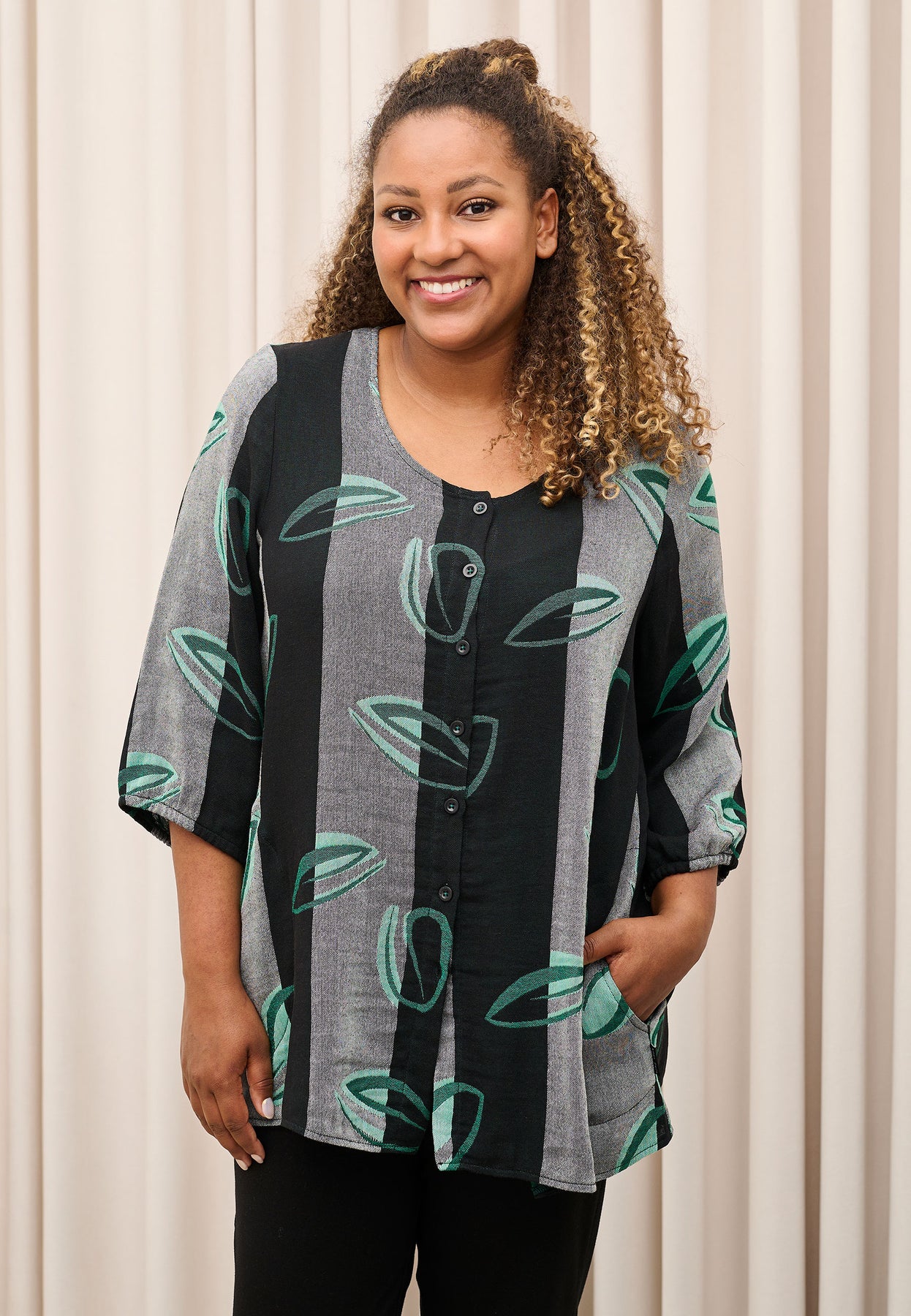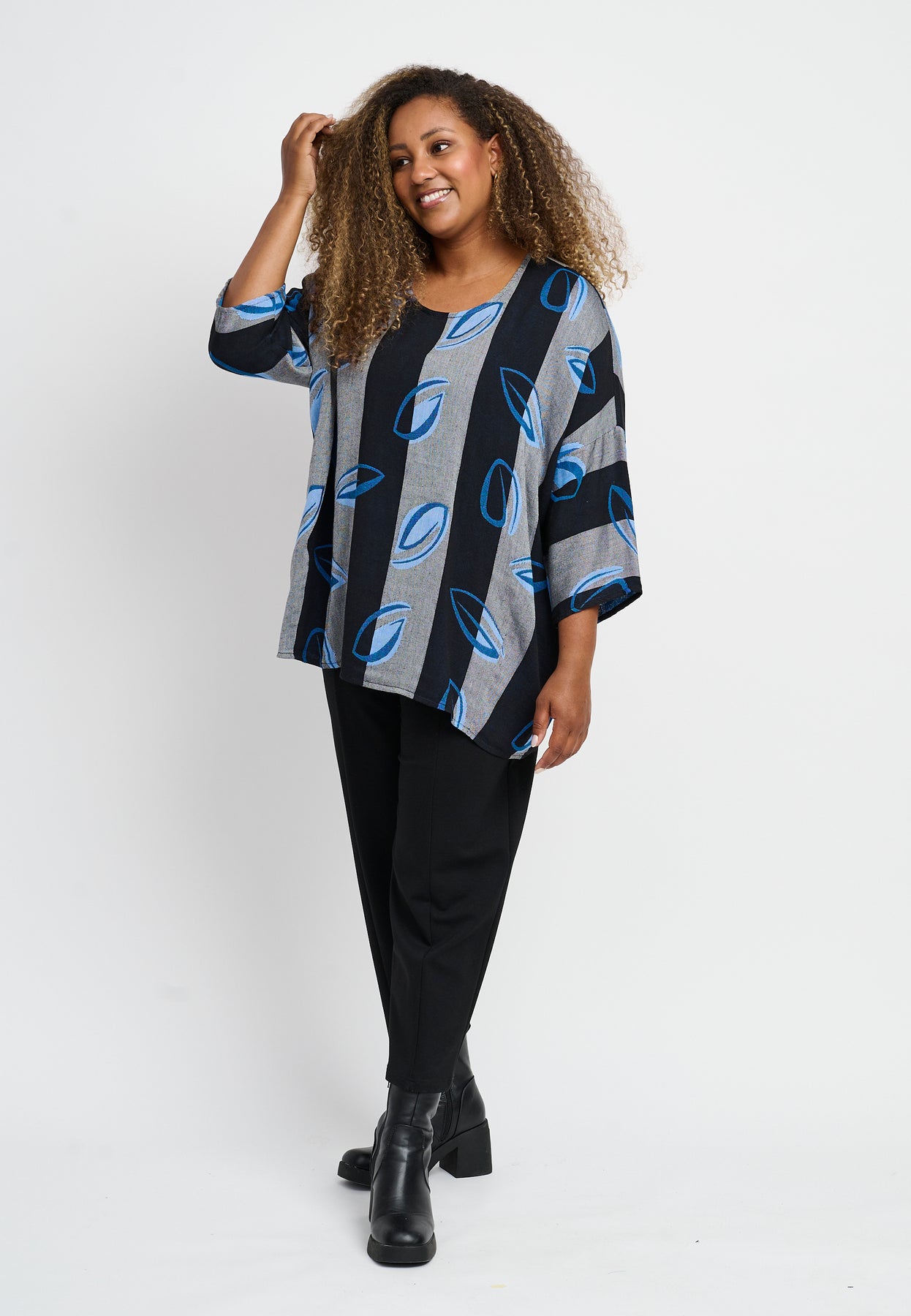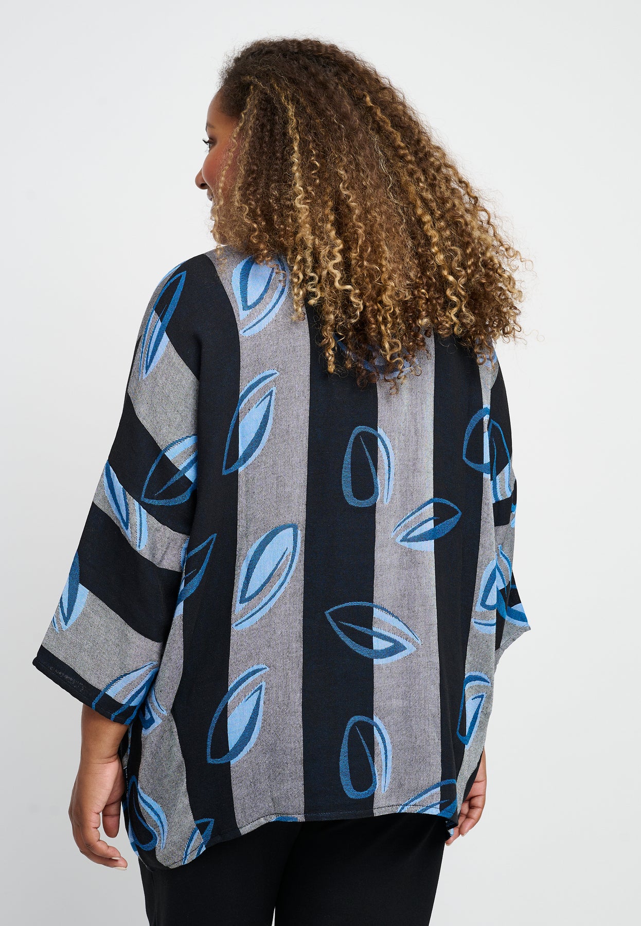 Fin bluse med ¾-lange og en rund halsudskæring. Den har et flot, bredstribet design med et farverigt print. Blusen er lavet i en let og lækker bomuldsblanding, og den har en oversized pasform, der er behagelig og rummelig.