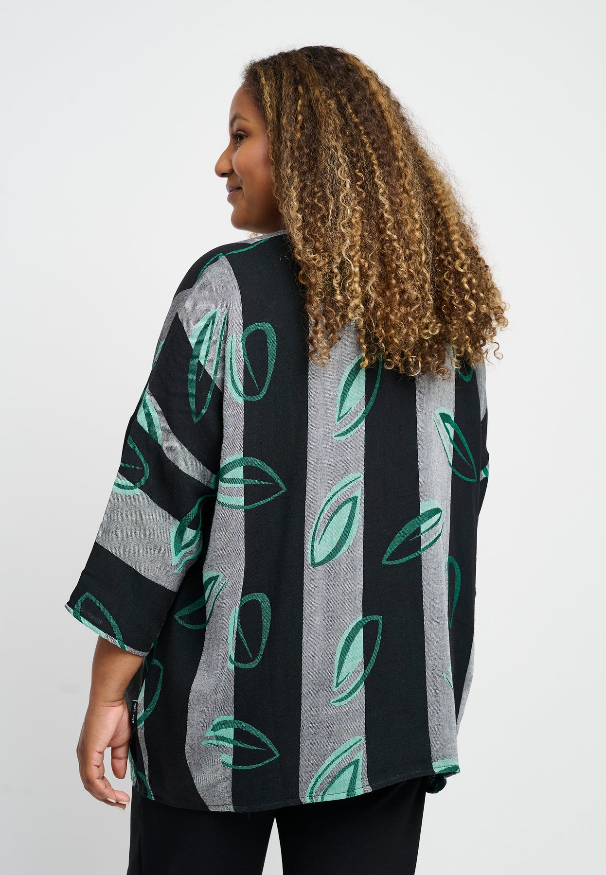 Modellen hedder Jea og er lavet i 50% bomuld, 45% viskose og 5% hør. Pasformen er ’Oversize’, og den er 70 cm lang bagtil i en str. M.