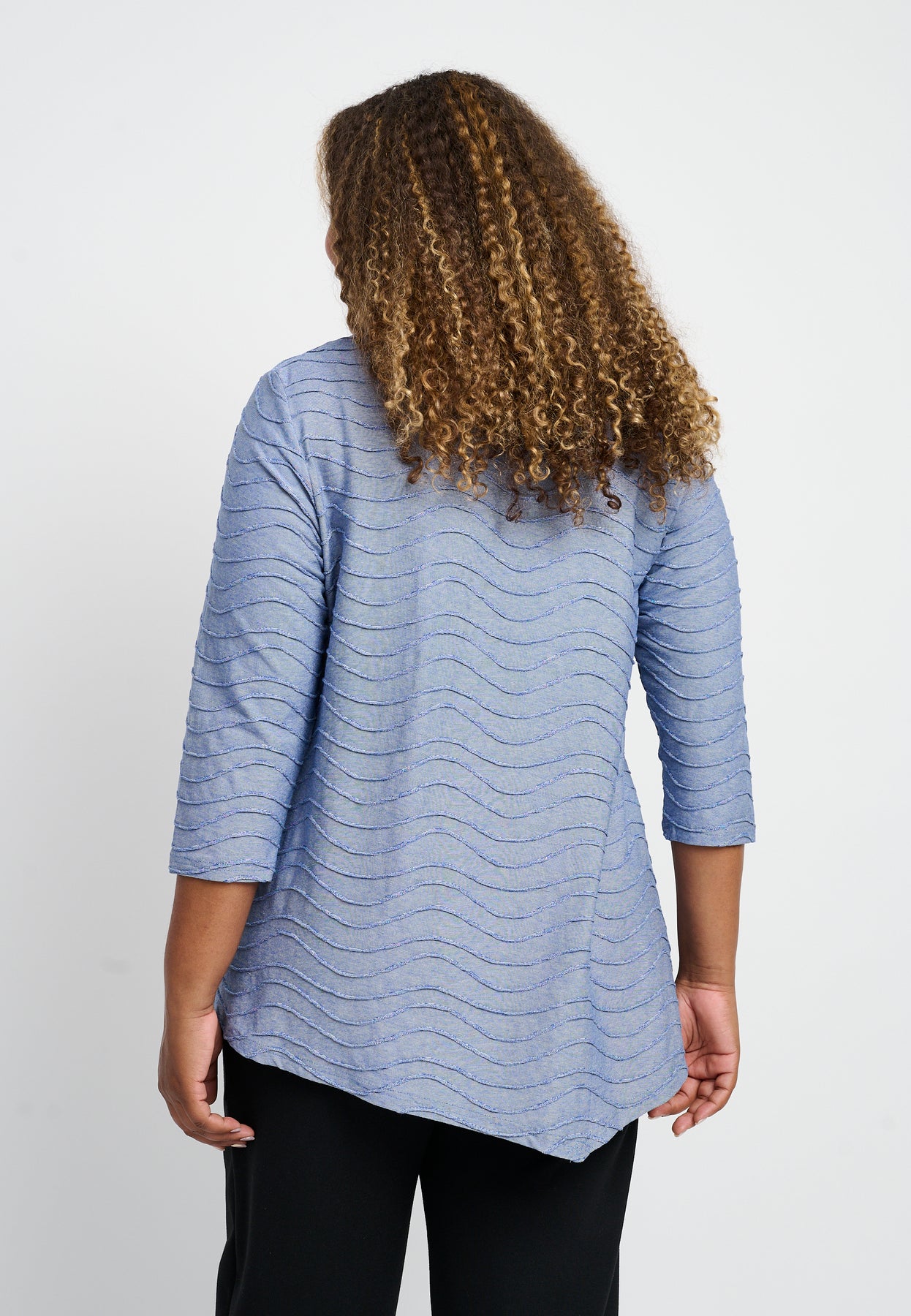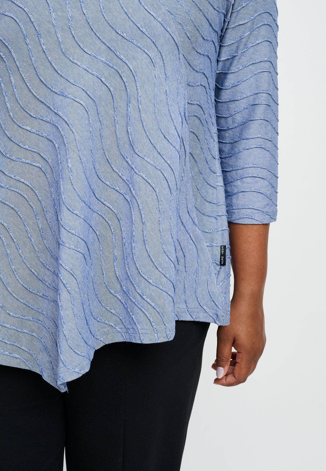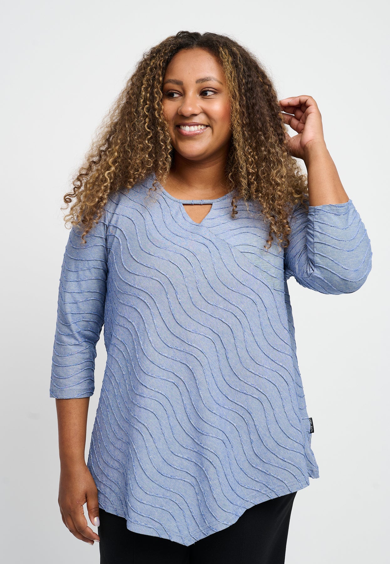 Fin bluse med ¾-lange ærmer og en unik halsudskæring. Den har et asymmetrisk design og et bølget mønster i lyse og glade farver. Blusen er udført i en skøn viskosekvalitet med stræk, og den har en A-formet pasform.