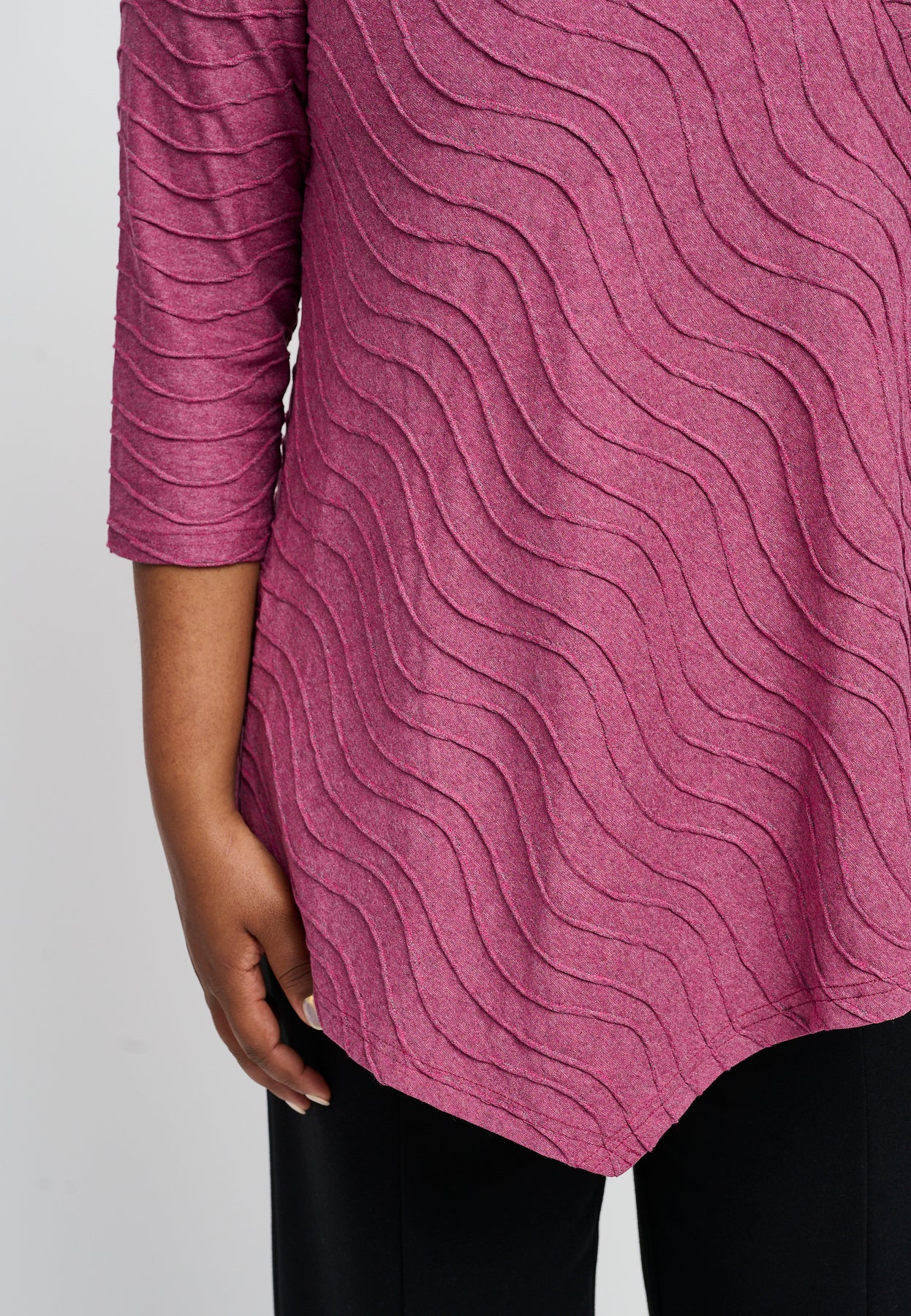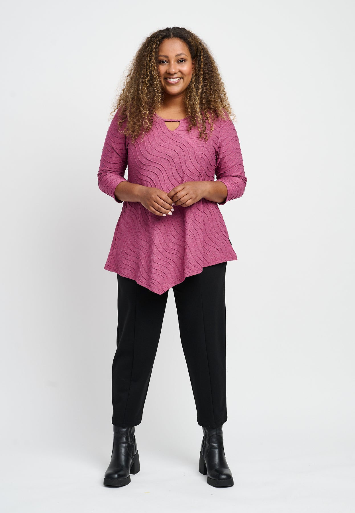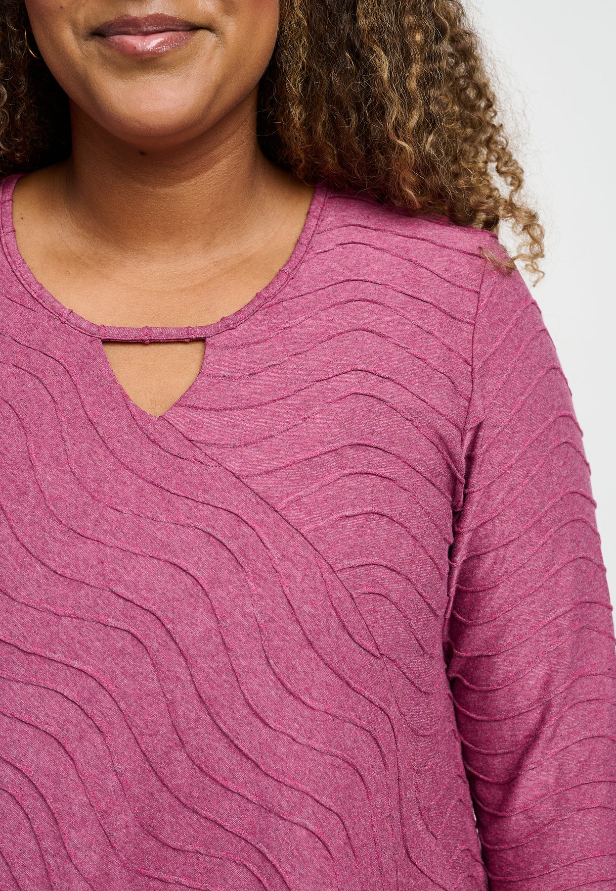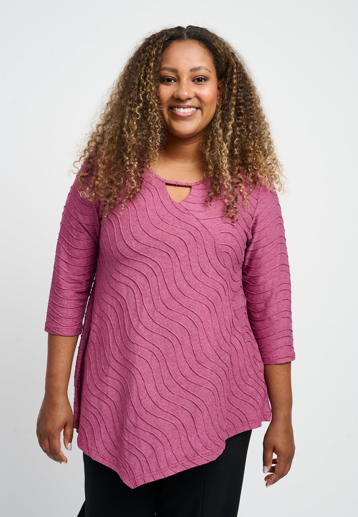 Fin bluse med ¾-lange ærmer og en unik halsudskæring. Den har et asymmetrisk design og et bølget mønster i lyse og glade farver. Blusen er udført i en skøn viskosekvalitet med stræk, og den har en A-formet pasform.
