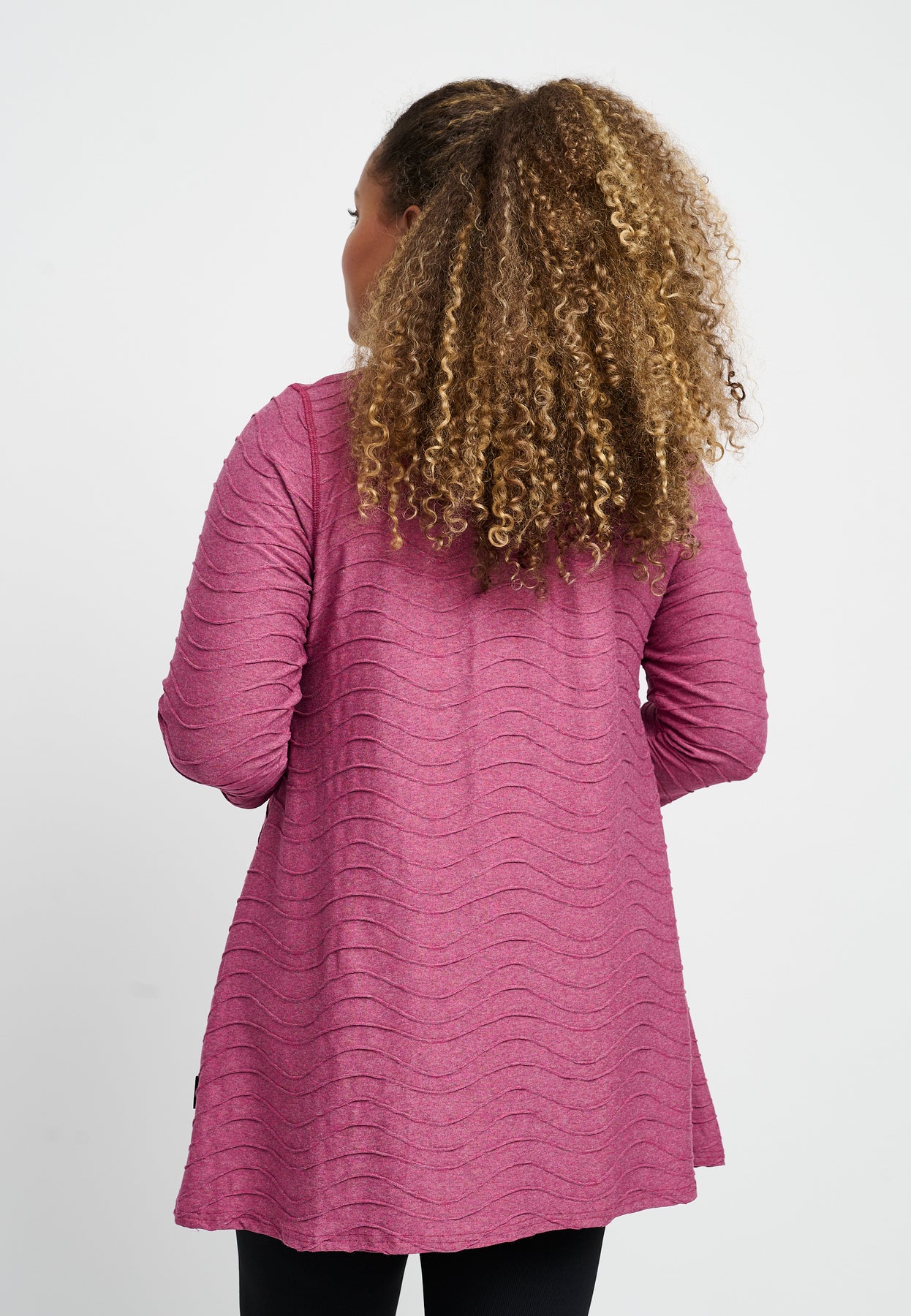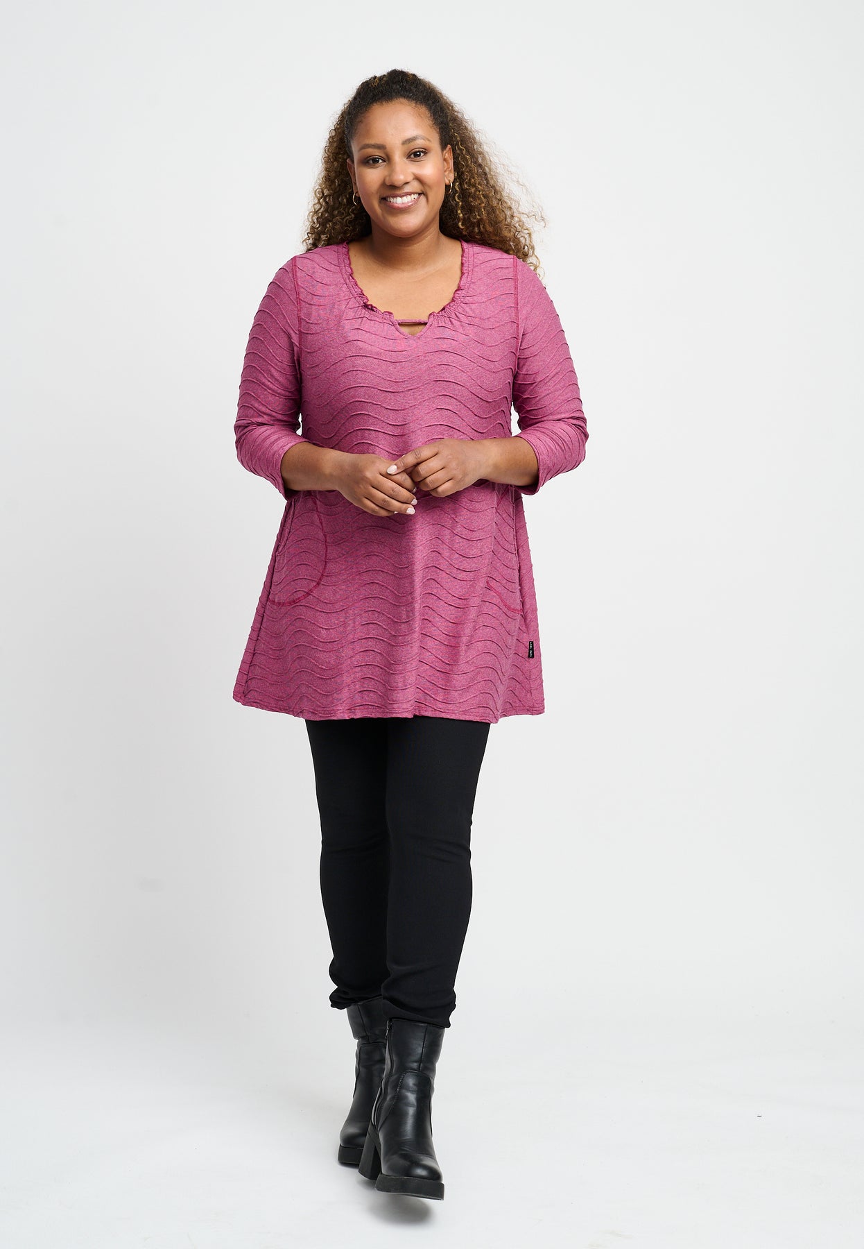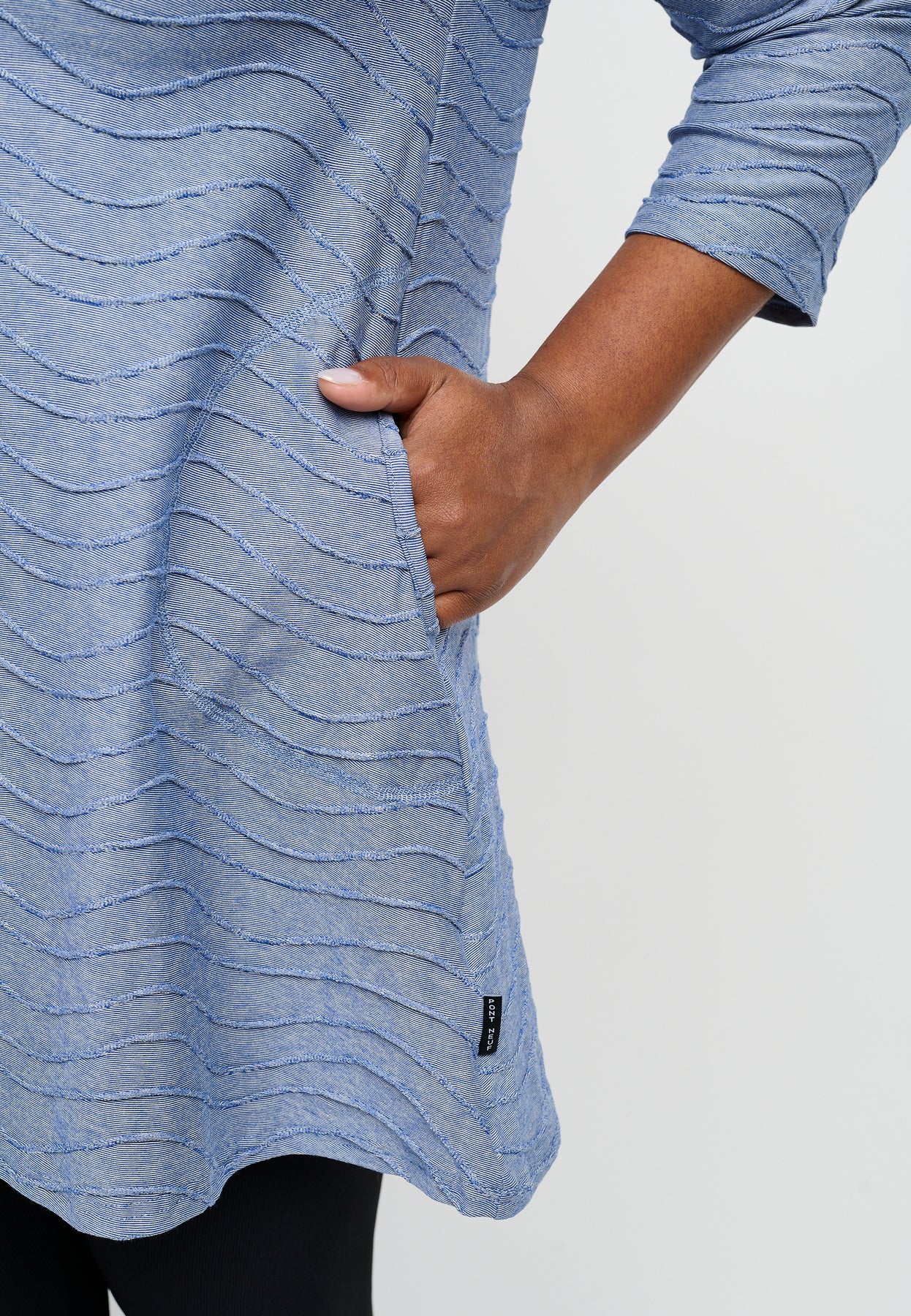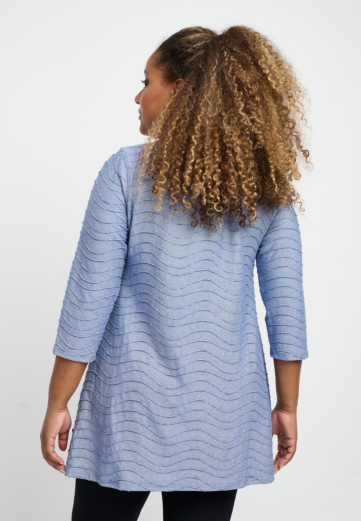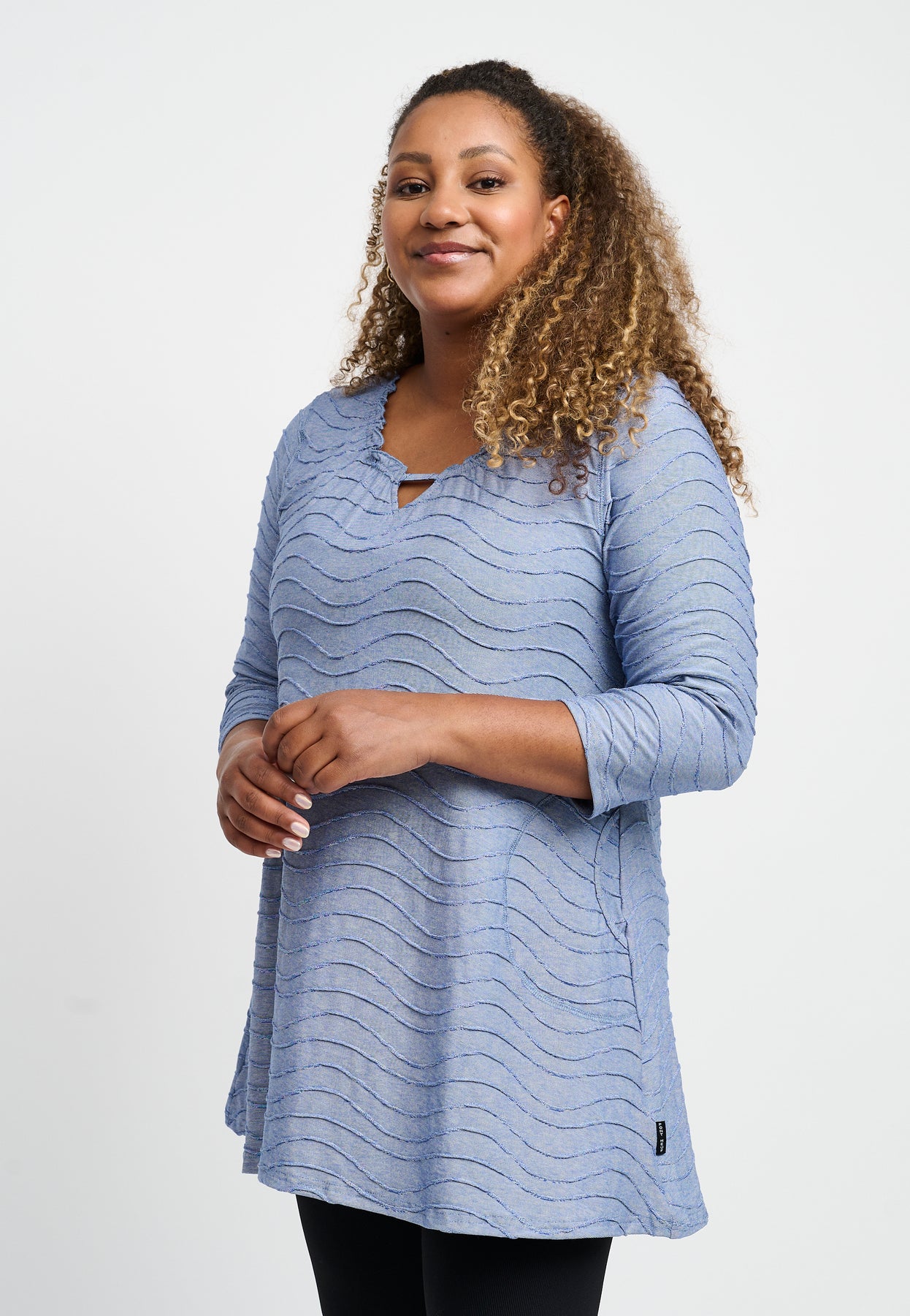 Sød og feminin tunika med ¾-lange ærmer og en unik halsudskæring. Den har lommer i siderne og et bølget mønster i lyse og glade farver. Blusen er udført i den blødeste viskosekvalitet med stræk, og den har en A-formet pasform.