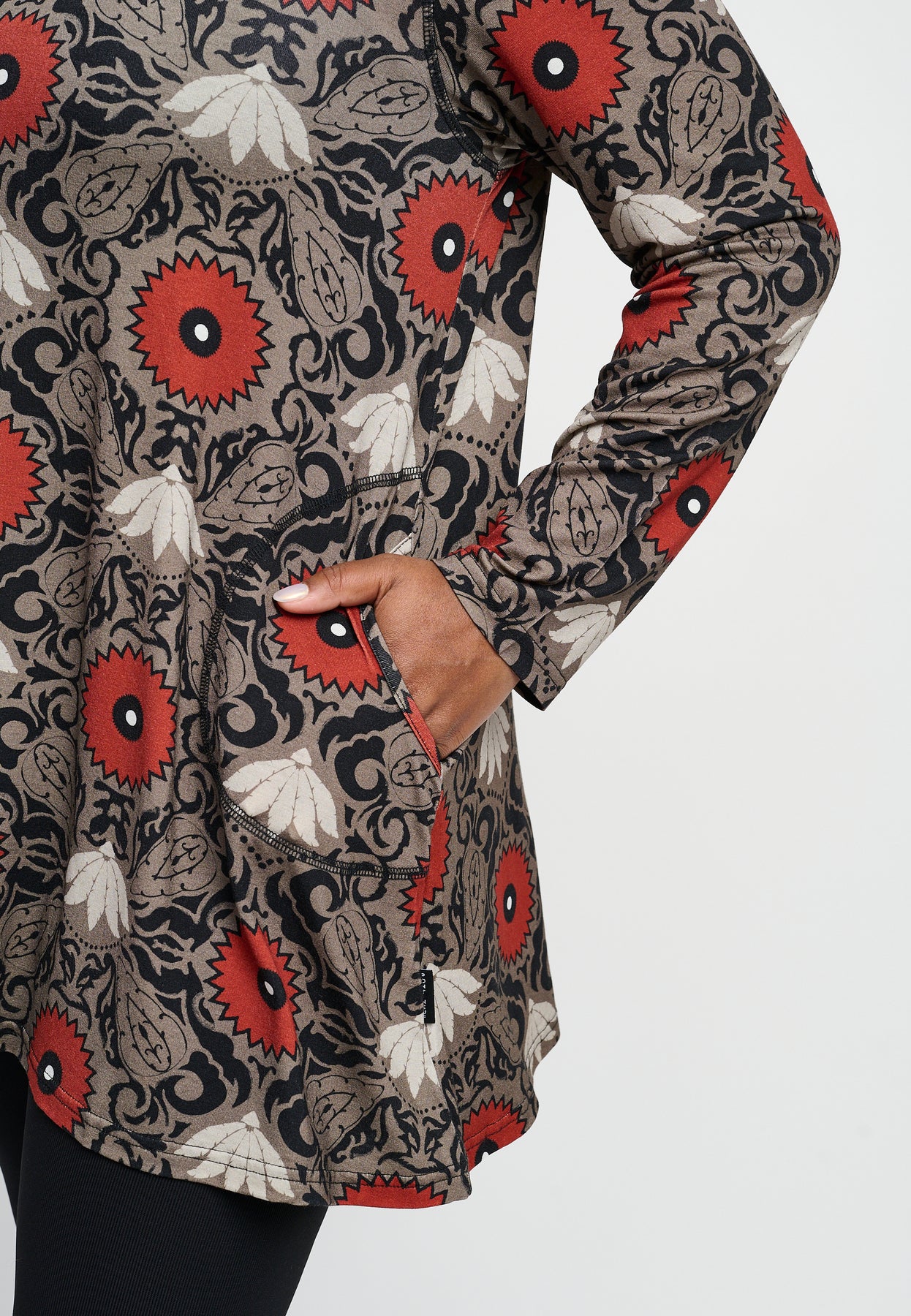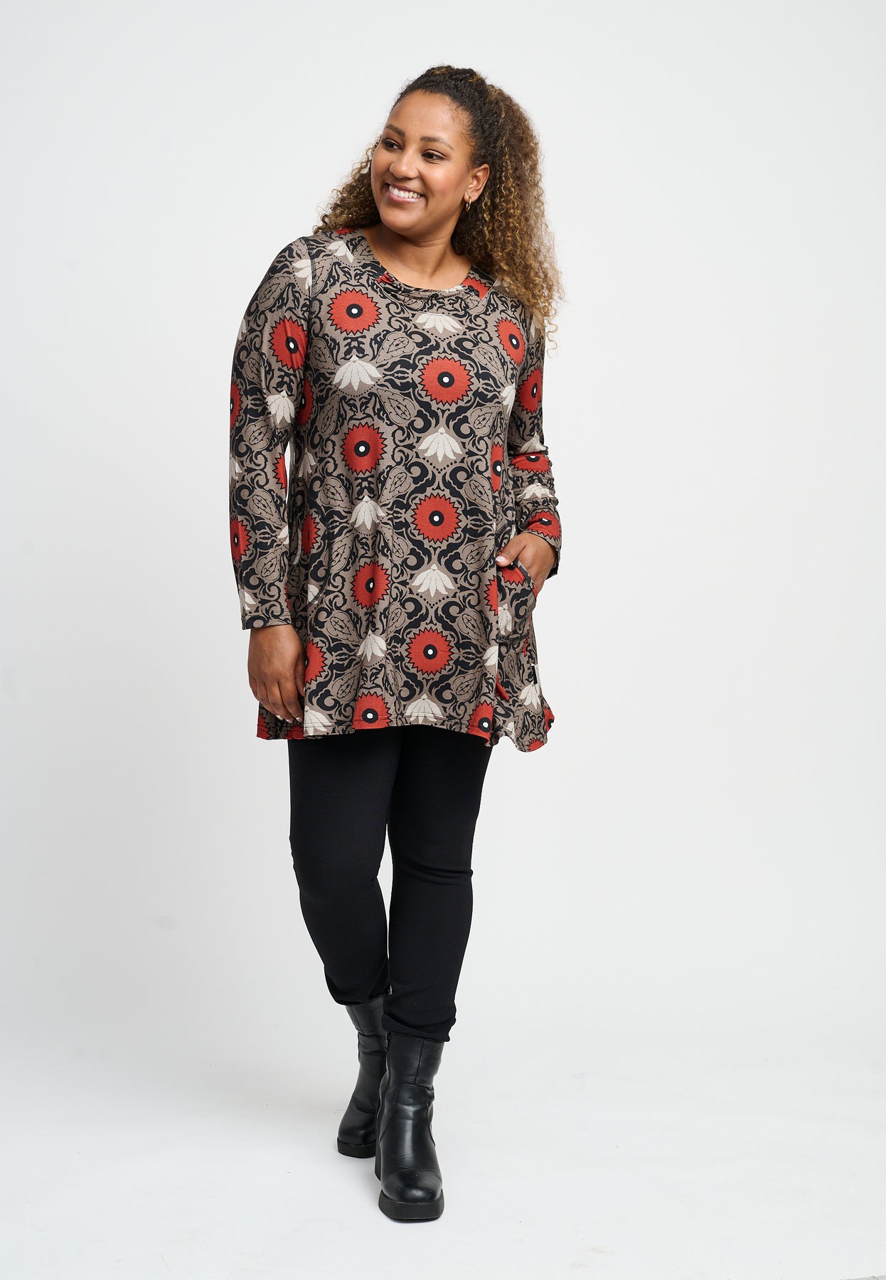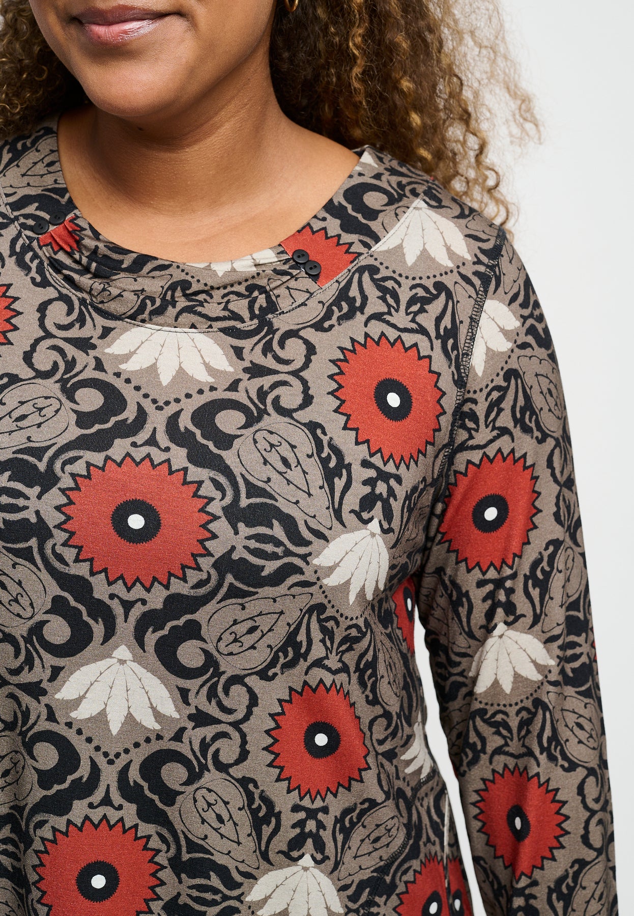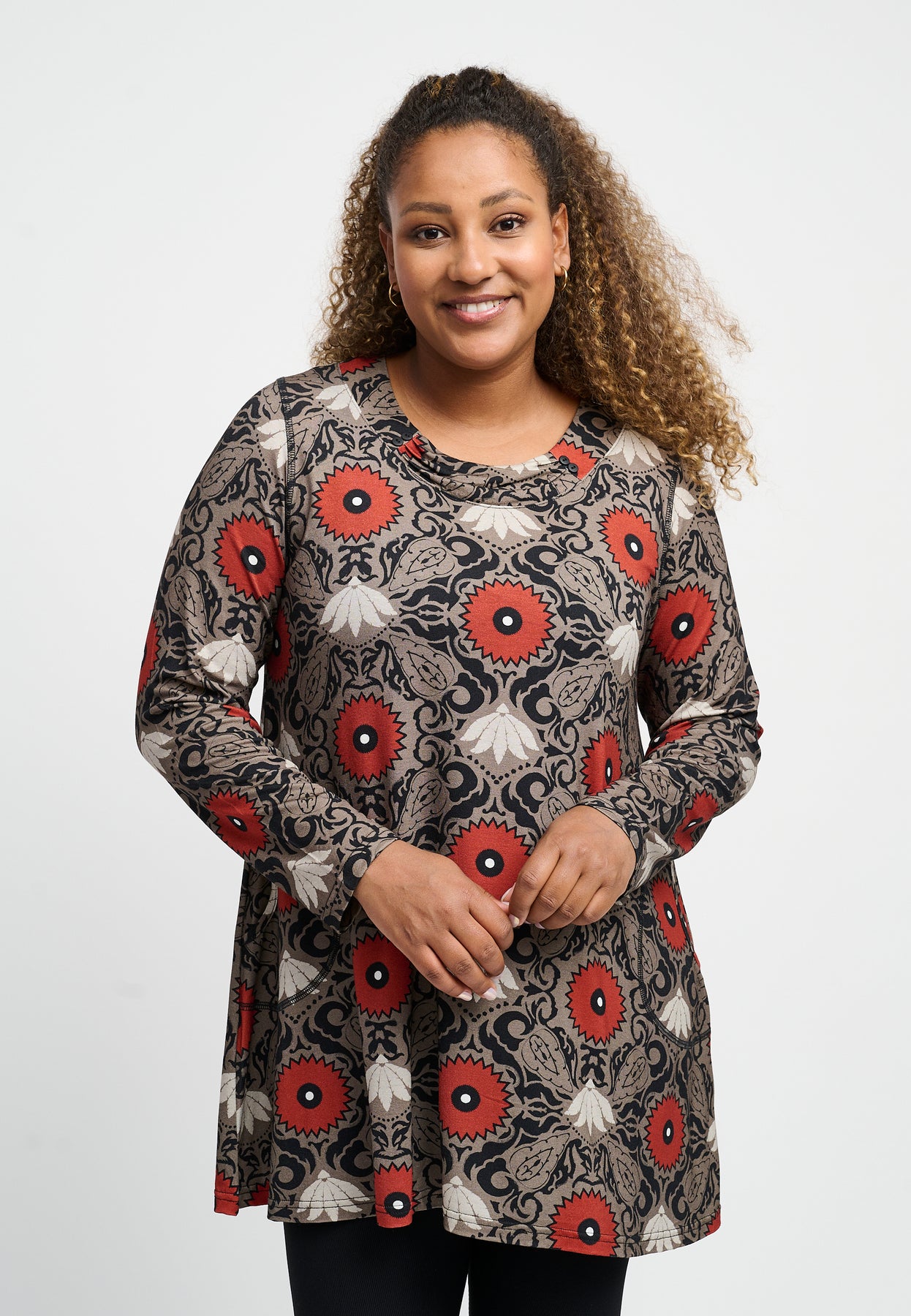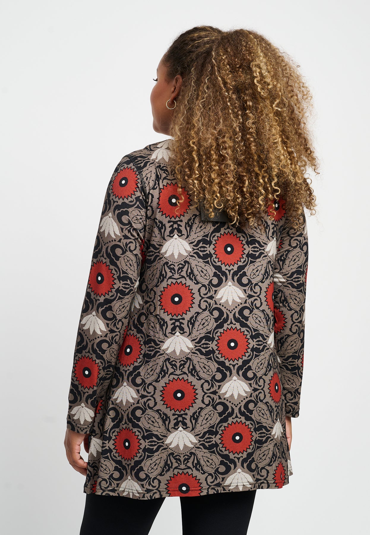 Sød, kort tunika med lange ærmer og en flot, rund halsudskæring. Den har et mønstret design med blomstermotiv i de fineste farver. Tunikaen er udført i en lækker viskosekvalitet med stræk, som understreger den A-formede pasform.