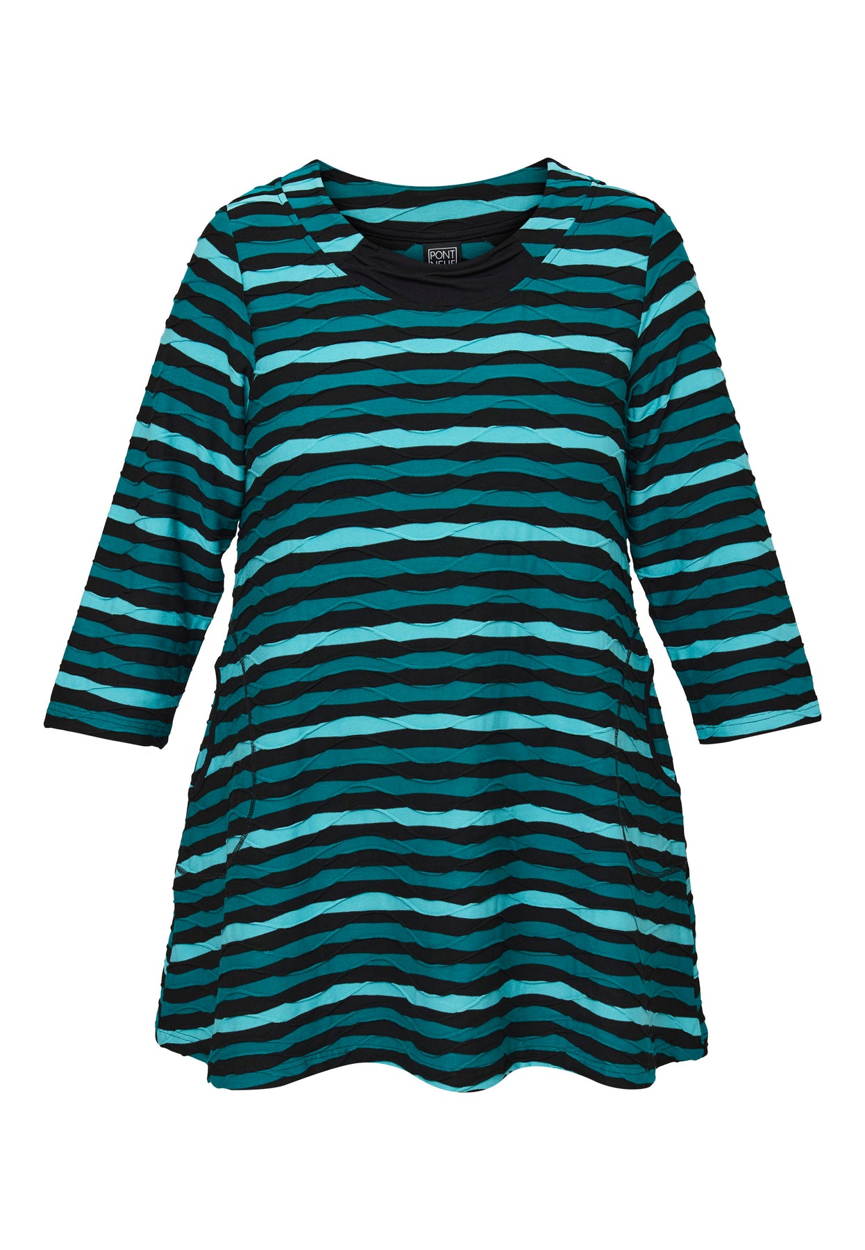 Denne tunika emmer af energi med sit stribede mønster, der giver et moderne og levende udtryk. Det A-formede snit sikrer en flatterende silhuet, mens den bløde viskosekvalitet med stretch føles behagelig og giver frihed til at bevæge sig. Afslappet og stilren – perfekt til hverdagen, men også let at opgradere til mere festlige anledninger.